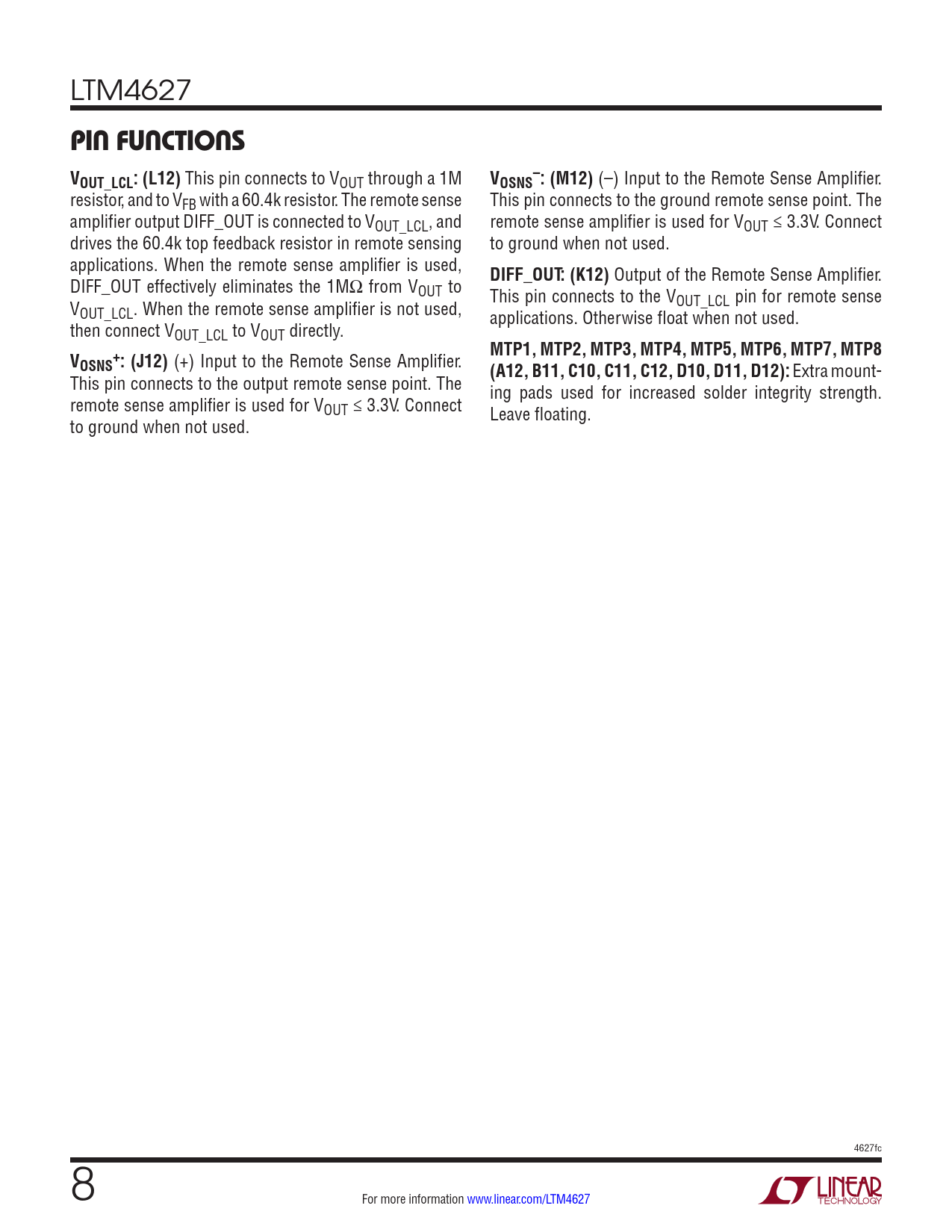 LTM4627 PIN FUNCTIONS V–OUT_LCL: (L12) This pin connects to VOUT through a 1M VOSNS : (M12) (–) Input to the Remote Sense Amplifier. resistor, and to VFB with a 60.4k resistor. The remote sense This pin connects to the ground remote sense point. The amplifier output DIFF_OUT is connected to VOUT_LCL, and remote sense amplifier is used for VOUT ≤ 3.3V. Connect drives the 60.4k top feedback resistor in remote sensing to ground when not used. applications. When the remote sense amplifier is used, DIFF_OUT: (K12) Output of the Remote Sense Amplifier. DIFF_OUT effectively eliminates the 1MΩ from VOUT to This pin connects to the V V OUT_LCL pin for remote sense OUT_LCL. When the remote sense amplifier is not used, applications. Otherwise float when not used. then connect VOUT_LCL to VOUT directly. MTP1, MTP2, MTP3, MTP4, MTP5, MTP6, MTP7, MTP8V+OSNS : (J12) (+) Input to the Remote Sense Amplifier. (A12, B11, C10, C11, C12, D10, D11, D12): Extra mount- This pin connects to the output remote sense point. The ing pads used for increased solder integrity strength. remote sense amplifier is used for VOUT ≤ 3.3V. Connect Leave floating. to ground when not used. 4627fc 8 For more information www.linear.com/LTM4627 Document Outline Features Applications Description Typical Application Absolute Maximum Ratings Pin Configuration Electrical Characteristics Typical Performance Characteristics Pin Functions Block Diagram Decoupling Requirements Operation Applications Information Typical Applications Package Description Package Photos Package Description Revision History Typical Application Related Parts