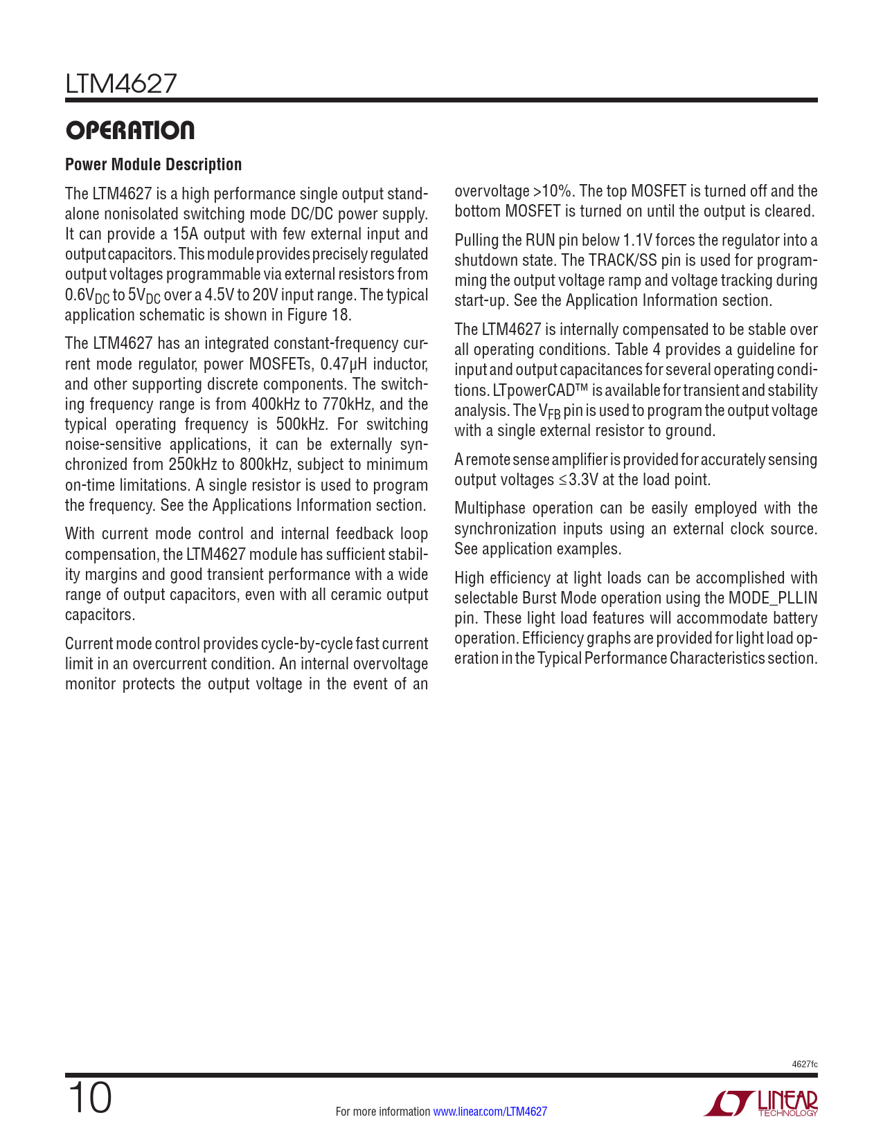 LTM4627 OPERATIONPower Module Description The LTM4627 is a high performance single output stand- overvoltage >10%. The top MOSFET is turned off and the alone nonisolated switching mode DC/DC power supply. bottom MOSFET is turned on until the output is cleared. It can provide a 15A output with few external input and Pulling the RUN pin below 1.1V forces the regulator into a output capacitors. This module provides precisely regulated shutdown state. The TRACK/SS pin is used for program- output voltages programmable via external resistors from ming the output voltage ramp and voltage tracking during 0.6VDC to 5VDC over a 4.5V to 20V input range. The typical start-up. See the Application Information section. application schematic is shown in Figure 18. The LTM4627 is internally compensated to be stable over The LTM4627 has an integrated constant-frequency cur- all operating conditions. Table 4 provides a guideline for rent mode regulator, power MOSFETs, 0.47µH inductor, input and output capacitances for several operating condi- and other supporting discrete components. The switch- tions. LTpowerCAD™ is available for transient and stability ing frequency range is from 400kHz to 770kHz, and the analysis. The V typical operating frequency is 500kHz. For switching FB pin is used to program the output voltage with a single external resistor to ground. noise-sensitive applications, it can be externally syn- chronized from 250kHz to 800kHz, subject to minimum A remote sense amplifier is provided for accurately sensing on-time limitations. A single resistor is used to program output voltages ≤3.3V at the load point. the frequency. See the Applications Information section. Multiphase operation can be easily employed with the With current mode control and internal feedback loop synchronization inputs using an external clock source. compensation, the LTM4627 module has sufficient stabil- See application examples. ity margins and good transient performance with a wide High efficiency at light loads can be accomplished with range of output capacitors, even with all ceramic output selectable Burst Mode operation using the MODE_PLLIN capacitors. pin. These light load features will accommodate battery Current mode control provides cycle-by-cycle fast current operation. Efficiency graphs are provided for light load op- limit in an overcurrent condition. An internal overvoltage eration in the Typical Performance Characteristics section. monitor protects the output voltage in the event of an 4627fc 10 For more information www.linear.com/LTM4627 Document Outline Features Applications Description Typical Application Absolute Maximum Ratings Pin Configuration Electrical Characteristics Typical Performance Characteristics Pin Functions Block Diagram Decoupling Requirements Operation Applications Information Typical Applications Package Description Package Photos Package Description Revision History Typical Application Related Parts