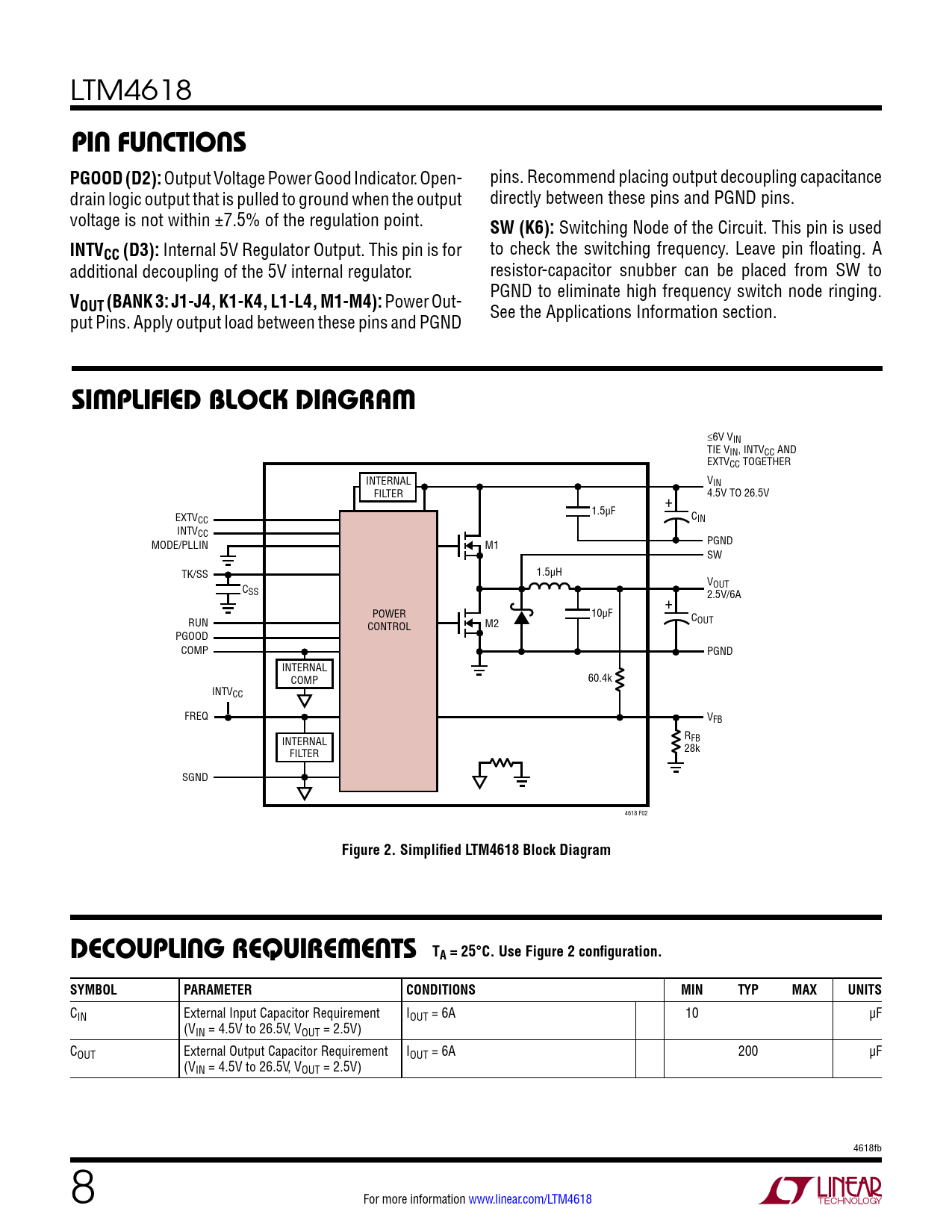 CIN External Input Capacitor Requirement IOUT = 6A 10 µF (VIN = 4.5V to 26.5V, VOUT = 2.5V) COUT External Output Capacitor Requirement IOUT = 6A 200 µF (VIN = 4.5V to 26.5V, VOUT = 2.5V) 4618fb 8 For more information www.linear.com/LTM4618 Document Outline Features Description Applications Typical Application Absolute Maximum Ratings Pin Configuration Order Information Electrical Characteristics Typical Performance Characteristics Pin Functions Simplified Block Diagram Decoupling Requirements Operation Applications Information Typical Applications Package Photograph Package Description Revision History Typical Application Related Parts