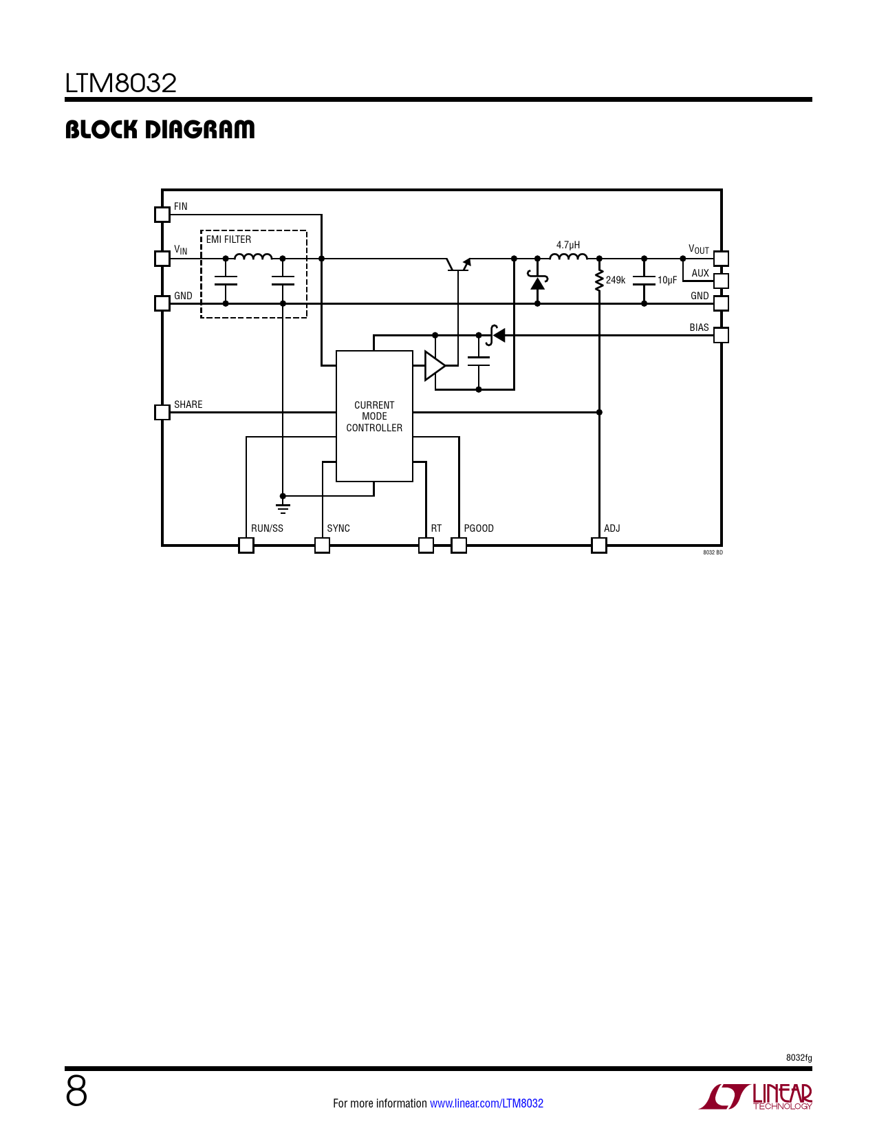 LTM8032 block DiagraM FIN EMI FILTER 4.7µH V V IN OUT AUX 249k 10µF GND GND BIAS SHARE CURRENT MODE CONTROLLER RUN/SS SYNC RT PGOOD ADJ 8032 BD 8032fg 8 For more information www.linear.com/LTM8032 Document Outline Features Applications Description Typical Application Absolute Maximum Ratings Pin Configuration Order Information Electrical Characteristics Typical Performance Characteristics Pin Functions Block Diagram Operation Applications Information Typical Applications Package Description Revision History Package Photographs Related Parts