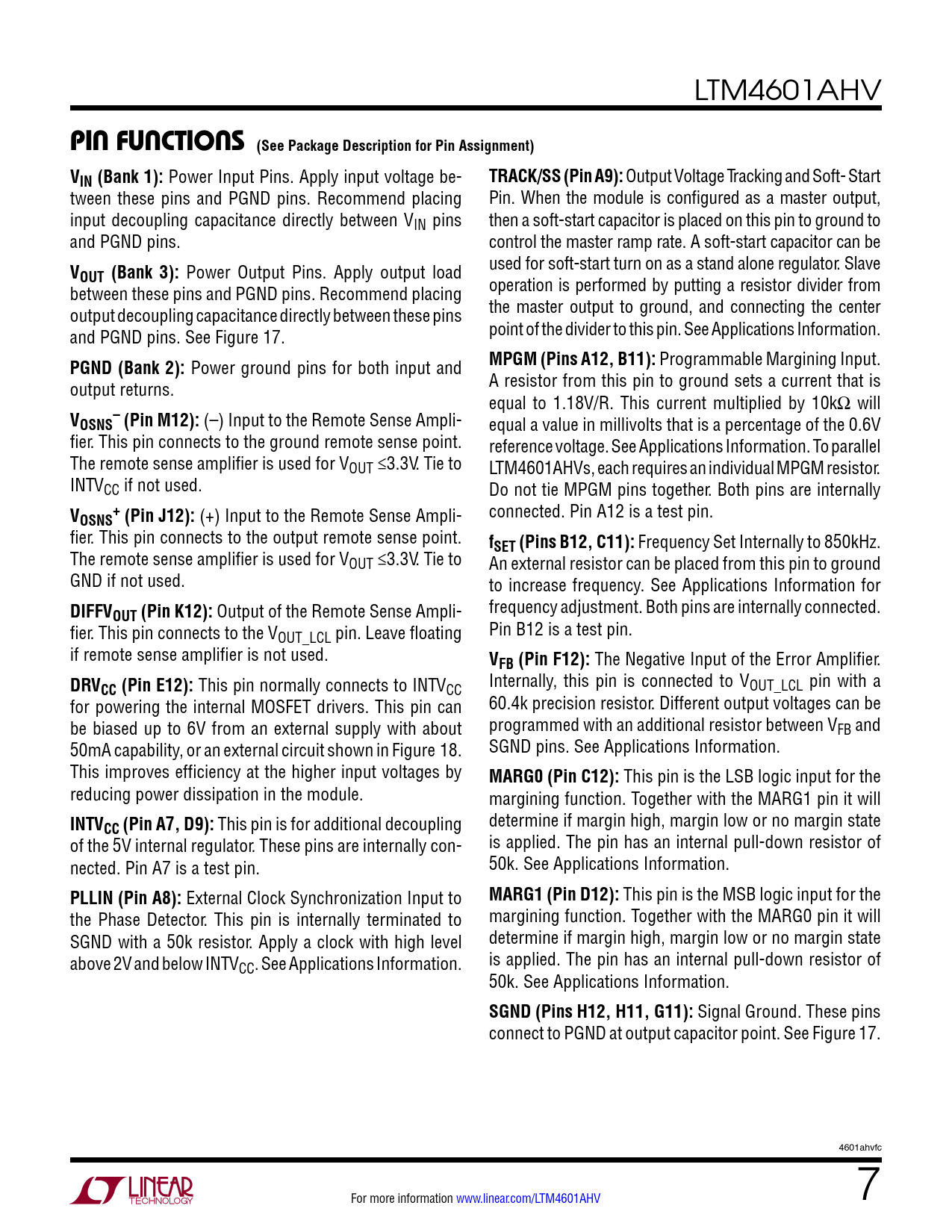 LTM4601AHV pin FuncTions (See Package Description for Pin Assignment) VIN (Bank 1): Power Input Pins. Apply input voltage be- TRACK/SS (Pin A9): Output Voltage Tracking and Soft- Start tween these pins and PGND pins. Recommend placing Pin. When the module is configured as a master output, input decoupling capacitance directly between VIN pins then a soft-start capacitor is placed on this pin to ground to and PGND pins. control the master ramp rate. A soft-start capacitor can be V used for soft-start turn on as a stand alone regulator. Slave OUT (Bank 3): Power Output Pins. Apply output load between these pins and PGND pins. Recommend placing operation is performed by putting a resistor divider from output decoupling capacitance directly between these pins the master output to ground, and connecting the center and PGND pins. See Figure 17. point of the divider to this pin. See Applications Information. PGND (Bank 2): Power ground pins for both input and MPGM (Pins A12, B11): Programmable Margining Input. output returns. A resistor from this pin to ground sets a current that is equal to 1.18V/R. This current multiplied by 10kΩ will V–OSNS (Pin M12): (–) Input to the Remote Sense Ampli- equal a value in millivolts that is a percentage of the 0.6V fier. This pin connects to the ground remote sense point. reference voltage. See Applications Information. To parallel The remote sense amplifier is used for VOUT ≤3.3V. Tie to LTM4601AHVs, each requires an individual MPGM resistor. INTVCC if not used. Do not tie MPGM pins together. Both pins are internally V+OSNS (Pin J12): (+) Input to the Remote Sense Ampli- connected. Pin A12 is a test pin. fier. This pin connects to the output remote sense point. fSET (Pins B12, C11): Frequency Set Internally to 850kHz. The remote sense amplifier is used for VOUT ≤3.3V. Tie to An external resistor can be placed from this pin to ground GND if not used. to increase frequency. See Applications Information for DIFFVOUT (Pin K12): Output of the Remote Sense Ampli- frequency adjustment. Both pins are internally connected. fier. This pin connects to the VOUT_LCL pin. Leave floating Pin B12 is a test pin. if remote sense amplifier is not used. VFB (Pin F12): The Negative Input of the Error Amplifier. DRVCC (Pin E12): This pin normally connects to INTVCC Internally, this pin is connected to VOUT_LCL pin with a for powering the internal MOSFET drivers. This pin can 60.4k precision resistor. Different output voltages can be be biased up to 6V from an external supply with about programmed with an additional resistor between VFB and 50mA capability, or an external circuit shown in Figure 18. SGND pins. See Applications Information. This improves efficiency at the higher input voltages by MARG0 (Pin C12): This pin is the LSB logic input for the reducing power dissipation in the module. margining function. Together with the MARG1 pin it will INTVCC (Pin A7, D9): This pin is for additional decoupling determine if margin high, margin low or no margin state of the 5V internal regulator. These pins are internally con- is applied. The pin has an internal pull-down resistor of nected. Pin A7 is a test pin. 50k. See Applications Information. PLLIN (Pin A8): External Clock Synchronization Input to MARG1 (Pin D12): This pin is the MSB logic input for the the Phase Detector. This pin is internally terminated to margining function. Together with the MARG0 pin it will SGND with a 50k resistor. Apply a clock with high level determine if margin high, margin low or no margin state above 2V and below INTVCC. See Applications Information. is applied. The pin has an internal pull-down resistor of 50k. See Applications Information. SGND (Pins H12, H11, G11): Signal Ground. These pins connect to PGND at output capacitor point. See Figure 17. 4601ahvfc For more information www.linear.com/LTM4601AHV 7 Document Outline Features Applications Description Typical Application Absolute Maximum Ratings Pin Configuration Order Information Electrical Characteristics Typical Performance Characteristics Pin Functions Simplified Block Diagram Decoupling Requirements Operation Applications Information Typical Applications Package Description Revision History Package Photos Related Parts