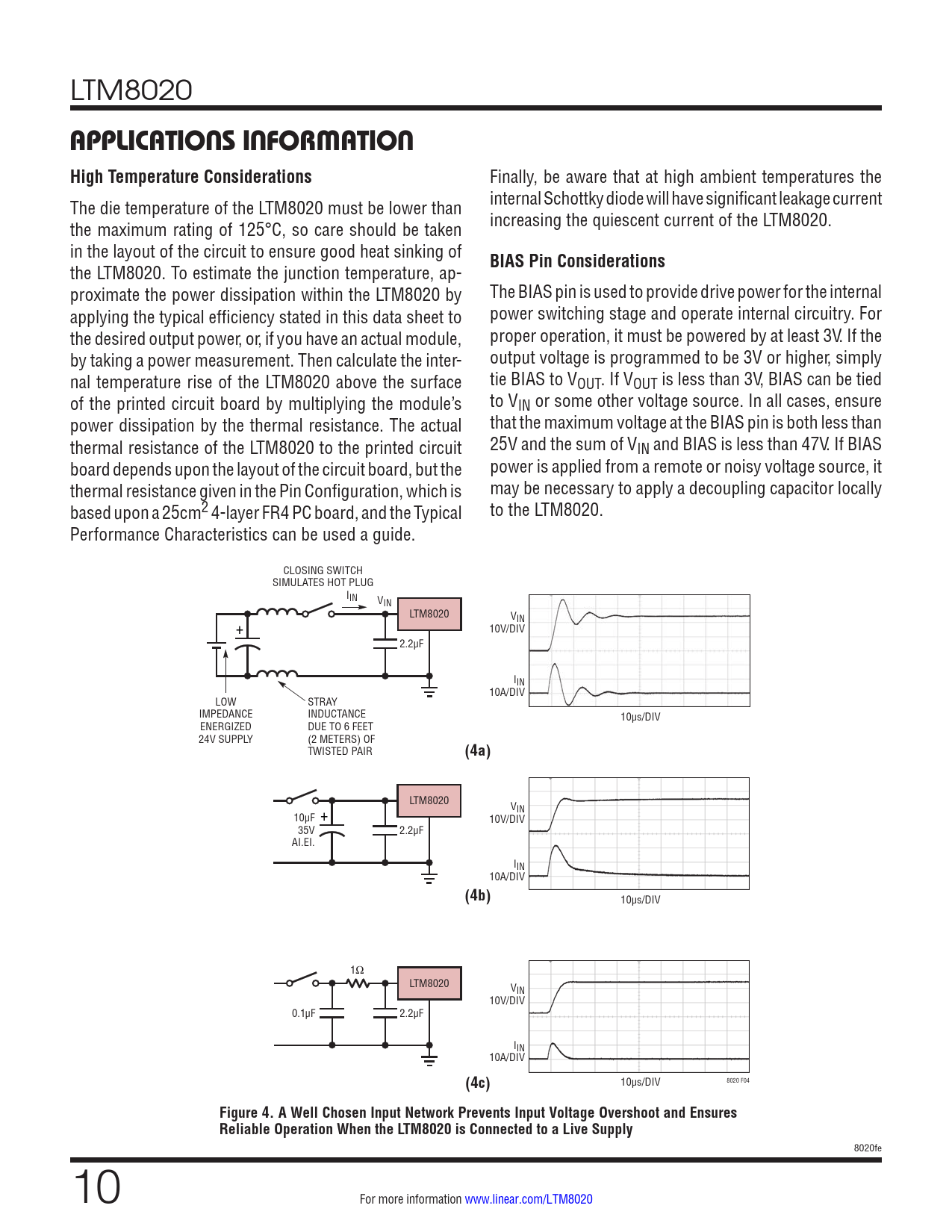the LTM8020. To estimate the junction temperature, ap- proximate the power dissipation within the LTM8020 by The BIAS pin is used to provide drive power for the internal applying the typical efficiency stated in this data sheet to power switching stage and operate internal circuitry. For the desired output power, or, if you have an actual module, proper operation, it must be powered by at least 3V. If the by taking a power measurement. Then calculate the inter- output voltage is programmed to be 3V or higher, simply nal temperature rise of the LTM8020 above the surface tie BIAS to VOUT. If VOUT is less than 3V, BIAS can be tied of the printed circuit board by multiplying the module’s to VIN or some other voltage source. In all cases, ensure power dissipation by the thermal resistance. The actual that the maximum voltage at the BIAS pin is both less than thermal resistance of the LTM8020 to the printed circuit 25V and the sum of VIN and BIAS is less than 47V. If BIAS board depends upon the layout of the circuit board, but the power is applied from a remote or noisy voltage source, it thermal resistance given in the Pin Configuration, which is may be necessary to apply a decoupling capacitor locally based upon a 25cm2 4-layer FR4 PC board, and the Typical to the LTM8020. Performance Characteristics can be used a guide. CLOSING SWITCH SIMULATES HOT PLUG IIN VIN LTM8020 VIN + 10V/DIV 2.2µF IIN 10A/DIV LOW STRAY IMPEDANCE INDUCTANCE 10µs/DIV ENERGIZED DUE TO 6 FEET 24V SUPPLY (2 METERS) OF TWISTED PAIR