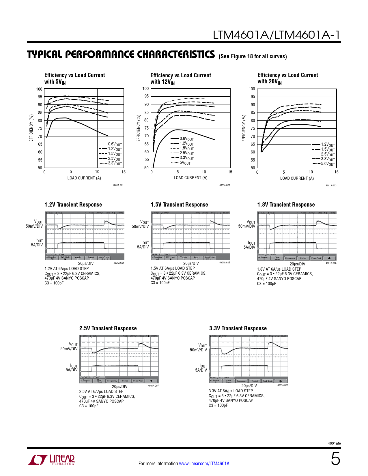 VOUT VOUT VOUT 50mV/DIV 50mV/DIV 50mV/DIV IOUT I 5A/DIV OUT IOUT 5A/DIV 5A/DIV 20µs/DIV 4601A G04 20µs/DIV 4601A G05 20µs/DIV 4601A G06 1.2V AT 6A/µs LOAD STEP 1.5V AT 6A/µs LOAD STEP 1.8V AT 6A/µs LOAD STEP COUT = 3 • 22µF 6.3V CERAMICS, COUT = 3 • 22µF 6.3V CERAMICS, COUT = 3 • 22µF 6.3V CERAMICS, 470µF 4V SANYO POSCAP 470µF 4V SANYO POSCAP 470µF 4V SANYO POSCAP C3 = 100pF C3 = 100pF C3 = 100pF