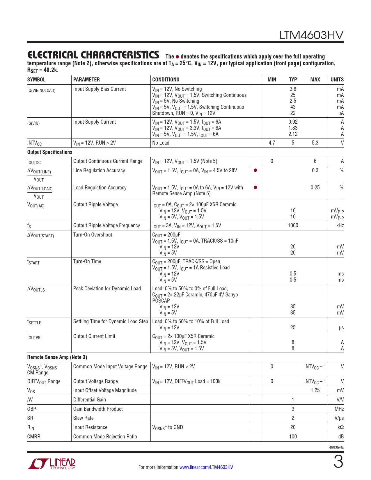 V + – OSNS , VOSNS Common Mode Input Voltage Range VIN = 12V, RUN > 2V 0 INTVCC – 1 V CM Range DIFFVOUT Range Output Voltage Range VIN = 12V, DIFFVOUT Load = 100k 0 INTVCC – 1 V VOS Input Offset Voltage Magnitude 1.25 mV AV Differential Gain 1 V/V GBP Gain Bandwidth Product 3 MHz SR Slew Rate 2 V/µs R + IN Input Resistance VOSNS to GND 20 kW CMRR Common Mode Rejection Ratio 100 dB 4603hvfa For more information www.linear.com/LTM4603HV 3 Document Outline Features Applications Description Typical Application Absolute Maximum Ratings Pin Configuration Order Information Electrical Characteristics Typical Performance Characteristics Pin Functions Block Diagram Decoupling Requirements Operation Applications Information Typical Applications Package Description Revision History Related Parts
