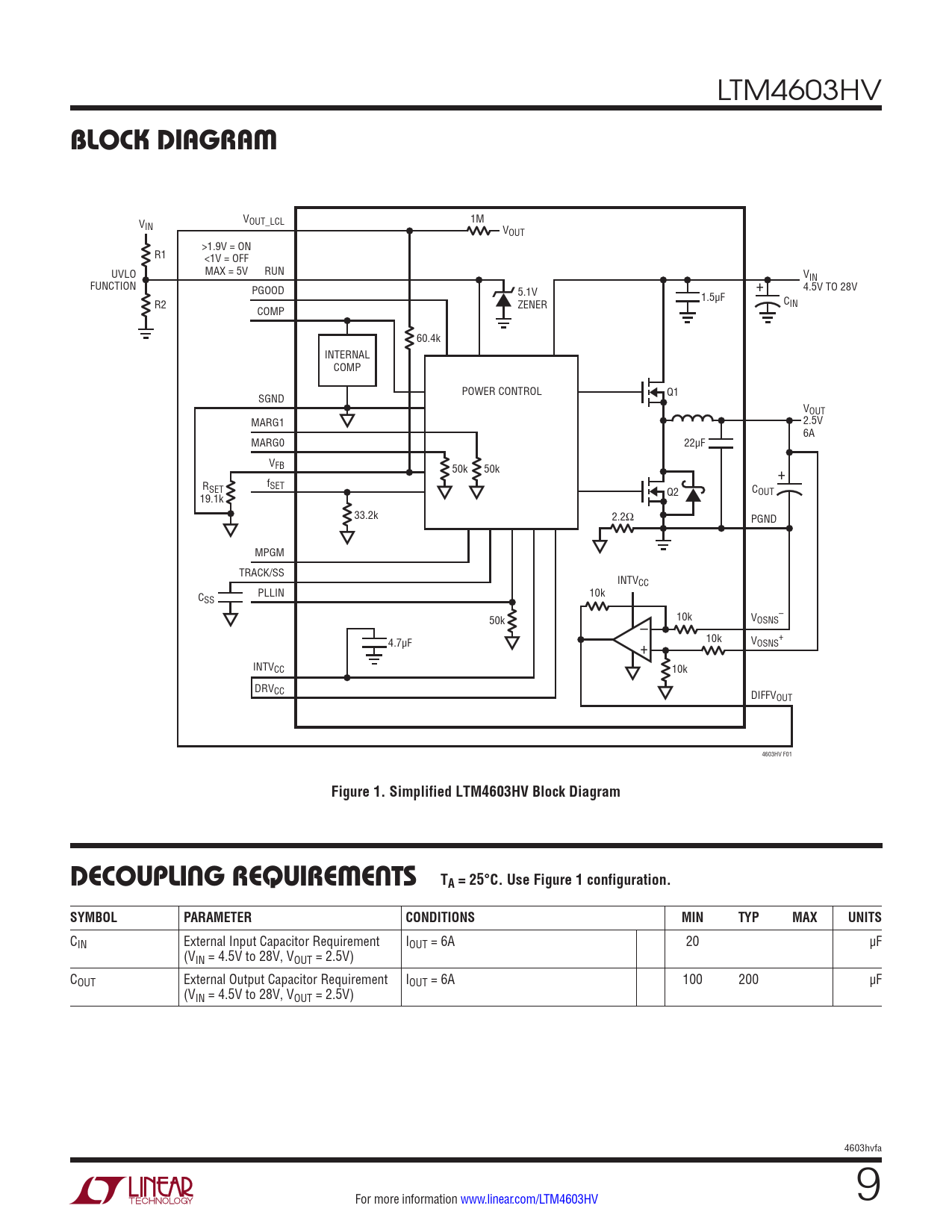 Figure 1. Simplified LTM4603HV Block Diagram Decoupling requireMenTs TA = 25°C. Use Figure 1 configuration. SYMBOL PARAMETER CONDITIONS MIN TYP MAX UNITS