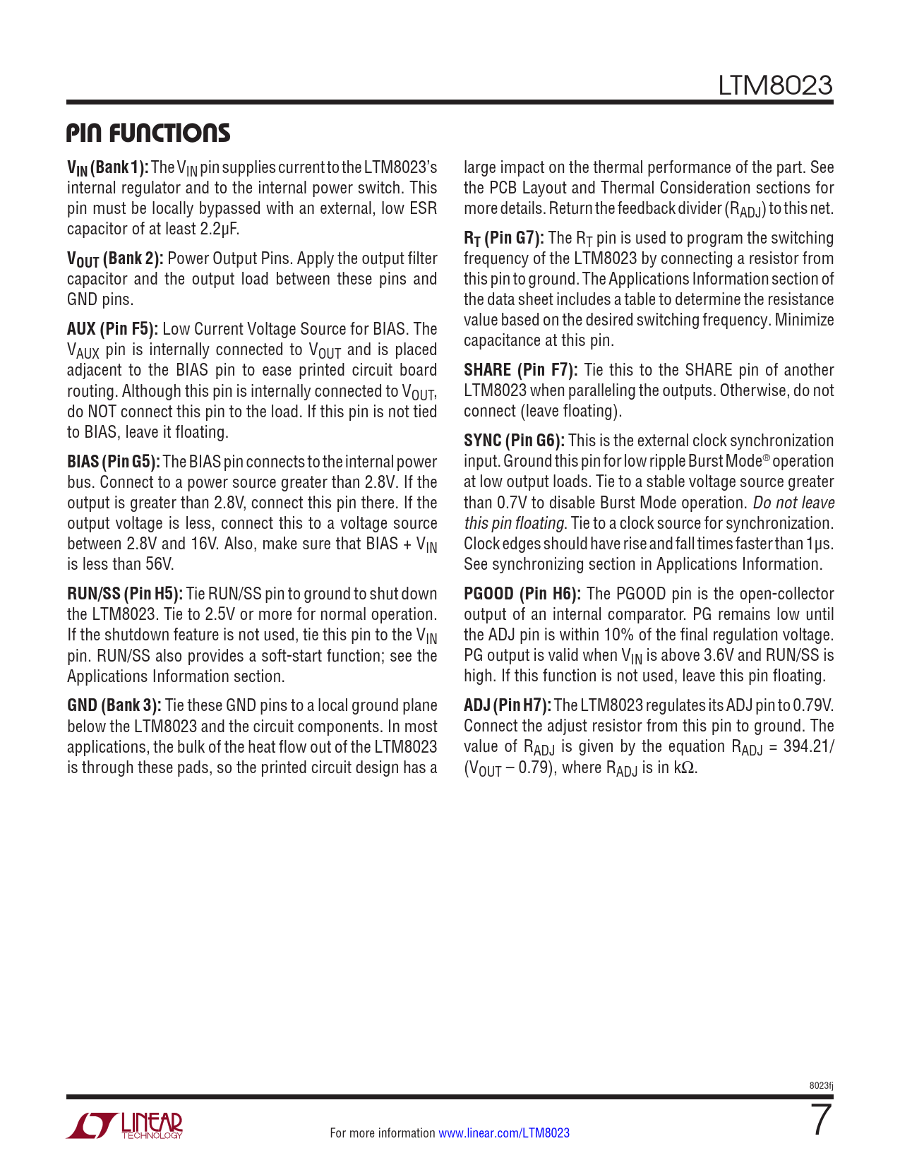 LTM8023 PIN FUNCTIONSVIN (Bank 1): The VIN pin supplies current to the LTM8023’s large impact on the thermal performance of the part. See internal regulator and to the internal power switch. This the PCB Layout and Thermal Consideration sections for pin must be locally bypassed with an external, low ESR more details. Return the feedback divider (RADJ) to this net. capacitor of at least 2.2µF. RT (Pin G7): The RT pin is used to program the switching VOUT (Bank 2): Power Output Pins. Apply the output filter frequency of the LTM8023 by connecting a resistor from capacitor and the output load between these pins and this pin to ground. The Applications Information section of GND pins. the data sheet includes a table to determine the resistance AUX (Pin F5): Low Current Voltage Source for BIAS. The value based on the desired switching frequency. Minimize V capacitance at this pin. AUX pin is internally connected to VOUT and is placed adjacent to the BIAS pin to ease printed circuit board SHARE (Pin F7): Tie this to the SHARE pin of another routing. Although this pin is internally connected to VOUT, LTM8023 when paralleling the outputs. Otherwise, do not do NOT connect this pin to the load. If this pin is not tied connect (leave floating). to BIAS, leave it floating. SYNC (Pin G6): This is the external clock synchronization BIAS (Pin G5): The BIAS pin connects to the internal power input. Ground this pin for low ripple Burst Mode® operation bus. Connect to a power source greater than 2.8V. If the at low output loads. Tie to a stable voltage source greater output is greater than 2.8V, connect this pin there. If the than 0.7V to disable Burst Mode operation. Do not leave output voltage is less, connect this to a voltage source this pin floating. Tie to a clock source for synchronization. between 2.8V and 16V. Also, make sure that BIAS + VIN Clock edges should have rise and fall times faster than 1µs. is less than 56V. See synchronizing section in Applications Information. RUN/SS (Pin H5): Tie RUN/SS pin to ground to shut down PGOOD (Pin H6): The PGOOD pin is the open-collector the LTM8023. Tie to 2.5V or more for normal operation. output of an internal comparator. PG remains low until If the shutdown feature is not used, tie this pin to the VIN the ADJ pin is within 10% of the final regulation voltage. pin. RUN/SS also provides a soft-start function; see the PG output is valid when VIN is above 3.6V and RUN/SS is Applications Information section. high. If this function is not used, leave this pin floating. GND (Bank 3): Tie these GND pins to a local ground plane ADJ (Pin H7): The LTM8023 regulates its ADJ pin to 0.79V. below the LTM8023 and the circuit components. In most Connect the adjust resistor from this pin to ground. The applications, the bulk of the heat flow out of the LTM8023 value of RADJ is given by the equation RADJ = 394.21/ is through these pads, so the printed circuit design has a (VOUT – 0.79), where RADJ is in kΩ. 8023fj For more information www.linear.com/LTM8023 7