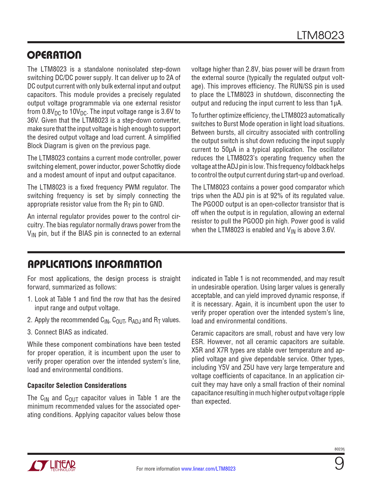 LTM8023 OPERATION The LTM8023 is a standalone nonisolated step-down voltage higher than 2.8V, bias power will be drawn from switching DC/DC power supply. It can deliver up to 2A of the external source (typically the regulated output volt- DC output current with only bulk external input and output age). This improves efficiency. The RUN/SS pin is used capacitors. This module provides a precisely regulated to place the LTM8023 in shutdown, disconnecting the output voltage programmable via one external resistor output and reducing the input current to less than 1µA. from 0.8VDC to 10VDC. The input voltage range is 3.6V to To further optimize efficiency, the LTM8023 automatically 36V. Given that the LTM8023 is a step-down converter, switches to Burst Mode operation in light load situations. make sure that the input voltage is high enough to support Between bursts, all circuitry associated with controlling the desired output voltage and load current. A simplified the output switch is shut down reducing the input supply Block Diagram is given on the previous page. current to 50µA in a typical application. The oscillator The LTM8023 contains a current mode controller, power reduces the LTM8023’s operating frequency when the switching element, power inductor, power Schottky diode voltage at the ADJ pin is low. This frequency foldback helps and a modest amount of input and output capacitance. to control the output current during start-up and overload. The LTM8023 is a fixed frequency PWM regulator. The The LTM8023 contains a power good comparator which switching frequency is set by simply connecting the trips when the ADJ pin is at 92% of its regulated value. appropriate resistor value from the RT pin to GND. The PGOOD output is an open-collector transistor that is An internal regulator provides power to the control cir- off when the output is in regulation, allowing an external cuitry. The bias regulator normally draws power from the resistor to pull the PGOOD pin high. Power good is valid V when the LTM8023 is enabled and VIN is above 3.6V. IN pin, but if the BIAS pin is connected to an external APPLICATIONS INFORMATION For most applications, the design process is straight indicated in Table 1 is not recommended, and may result forward, summarized as follows: in undesirable operation. Using larger values is generally 1. Look at Table 1 and find the row that has the desired acceptable, and can yield improved dynamic response, if input range and output voltage. it is necessary. Again, it is incumbent upon the user to verify proper operation over the intended system’s line, 2. Apply the recommended CIN, COUT, RADJ and RT values. load and environmental conditions. 3. Connect BIAS as indicated. Ceramic capacitors are small, robust and have very low While these component combinations have been tested ESR. However, not all ceramic capacitors are suitable. for proper operation, it is incumbent upon the user to X5R and X7R types are stable over temperature and ap- verify proper operation over the intended system’s line, plied voltage and give dependable service. Other types, load and environmental conditions. including Y5V and Z5U have very large temperature and voltage coefficients of capacitance. In an application cir- Capacitor Selection Considerations cuit they may have only a small fraction of their nominal capacitance resulting in much higher output voltage ripple The CIN and COUT capacitor values in Table 1 are the than expected. minimum recommended values for the associated oper- ating conditions. Applying capacitor values below those 8023fj For more information www.linear.com/LTM8023 9