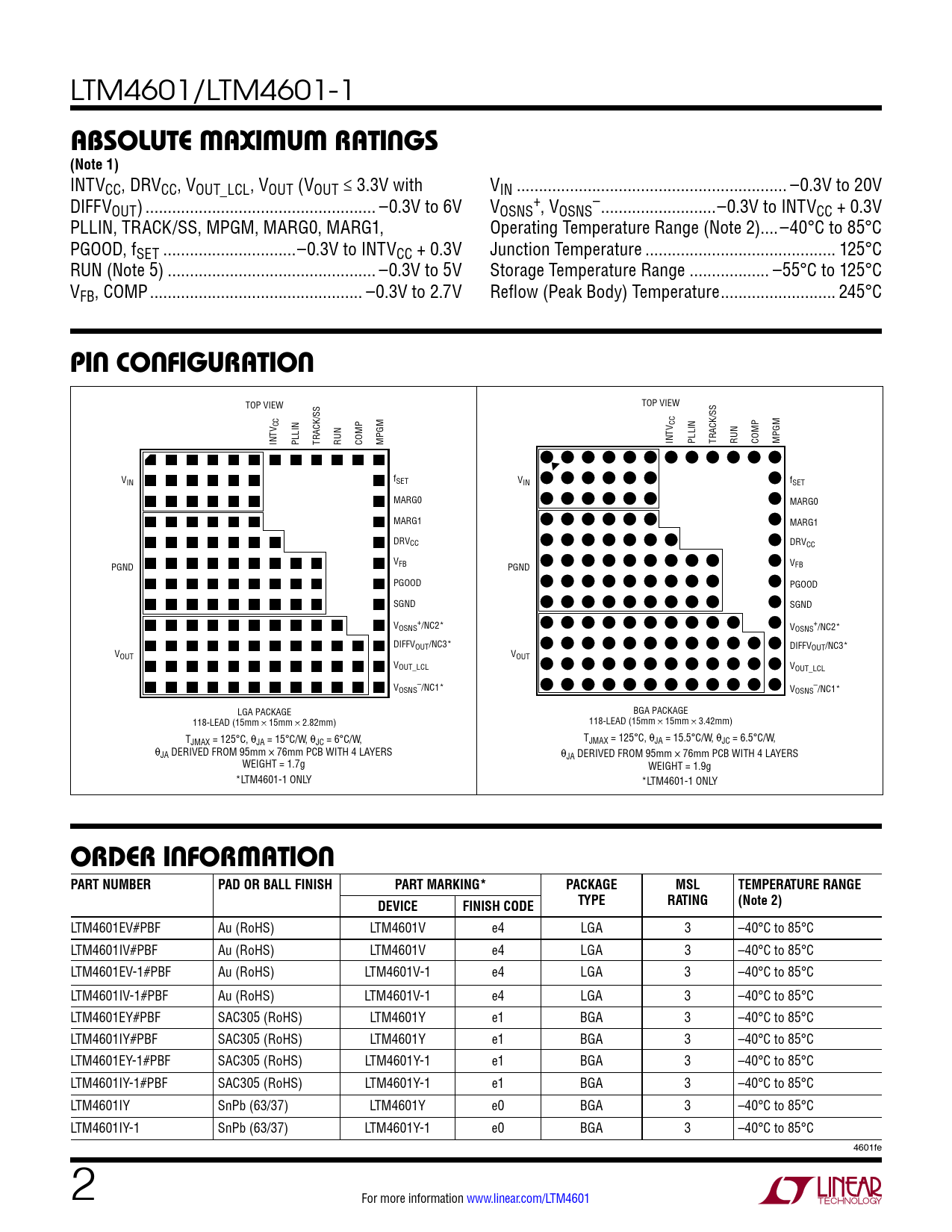 LTM4601EV#PBF Au (RoHS) LTM4601V e4 LGA 3 –40°C to 85°C LTM4601IV#PBF Au (RoHS) LTM4601V e4 LGA 3 –40°C to 85°C LTM4601EV-1#PBF Au (RoHS) LTM4601V-1 e4 LGA 3 –40°C to 85°C LTM4601IV-1#PBF Au (RoHS) LTM4601V-1 e4 LGA 3 –40°C to 85°C LTM4601EY#PBF SAC305 (RoHS) LTM4601Y e1 BGA 3 –40°C to 85°C LTM4601IY#PBF SAC305 (RoHS) LTM4601Y e1 BGA 3 –40°C to 85°C LTM4601EY-1#PBF SAC305 (RoHS) LTM4601Y-1 e1 BGA 3 –40°C to 85°C LTM4601IY-1#PBF SAC305 (RoHS) LTM4601Y-1 e1 BGA 3 –40°C to 85°C LTM4601IY SnPb (63/37) LTM4601Y e0 BGA 3 –40°C to 85°C LTM4601IY-1 SnPb (63/37) LTM4601Y-1 e0 BGA 3 –40°C to 85°C 4601fe 2 For more information www.linear.com/LTM4601 Document Outline Features Applications Description Typical Application Absolute Maximum Ratings Pin Configuration Electrical Characteristics Typical Performance Characteristics Pin Functions Simplified Block Diagram Decoupling Requirements Operation Applications Information Typical Applications Package Description Revision History Package Photo Related Parts