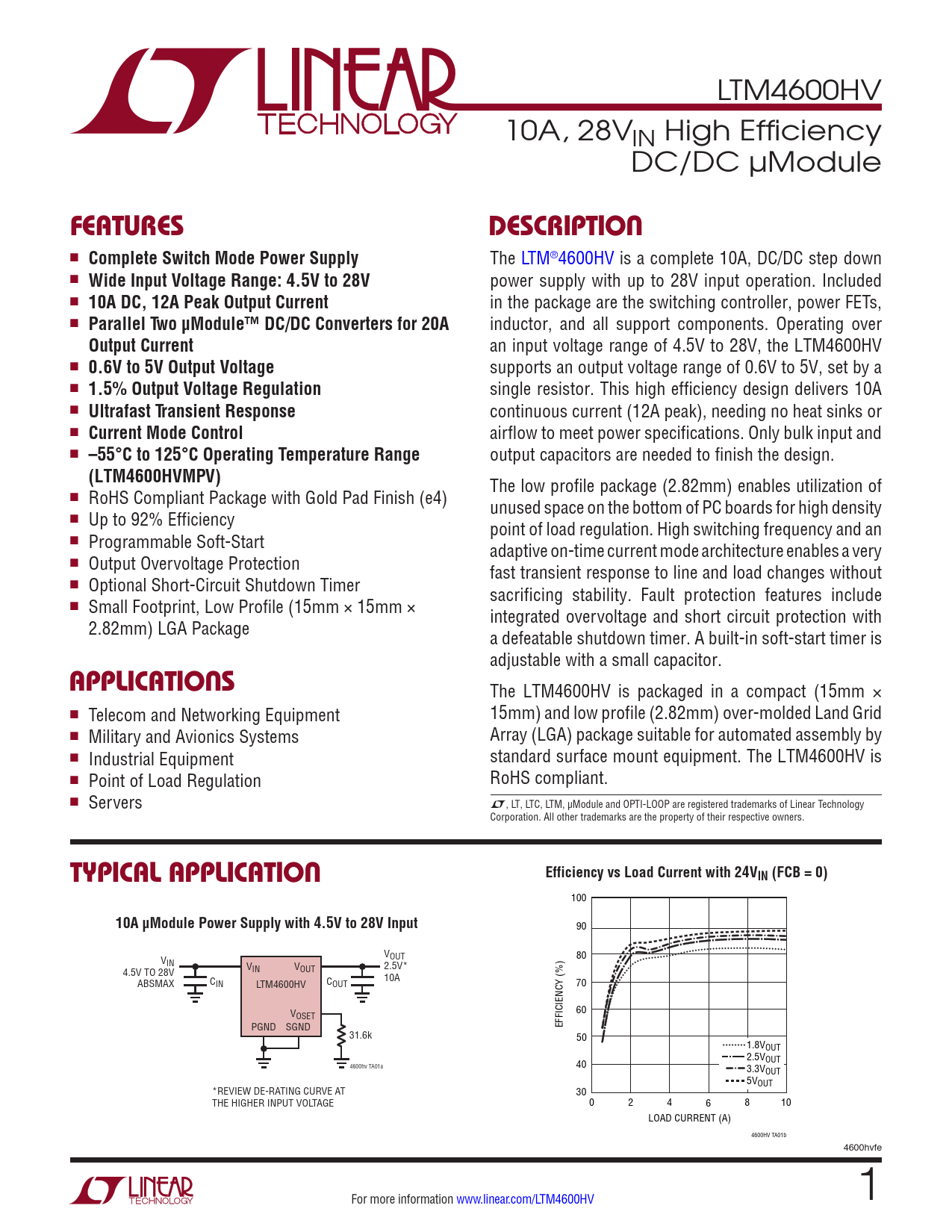 The LTM4600HV is packaged in a compact (15mm × n Telecom and Networking Equipment 15mm) and low profile (2.82mm) over-molded Land Grid n Military and Avionics Systems Array (LGA) package suitable for automated assembly by n Industrial Equipment standard surface mount equipment. The LTM4600HV is n Point of Load Regulation RoHS compliant. n Servers L, LT, LTC, LTM, µModule and OPTI-LOOP are registered trademarks of Linear Technology Corporation. All other trademarks are the property of their respective owners.