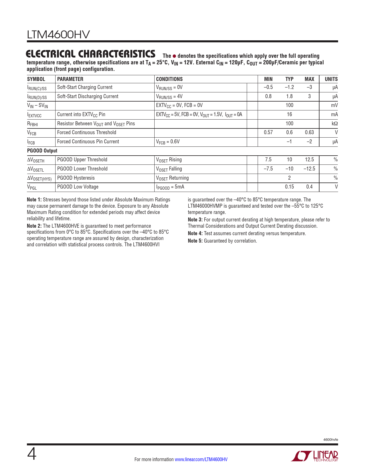 The LTM4600HVE is guaranteed to meet performance Thermal Considerations and Output Current Derating discussion. specifications from 0°C to 85°C. Specifications over the –40°C to 85°C