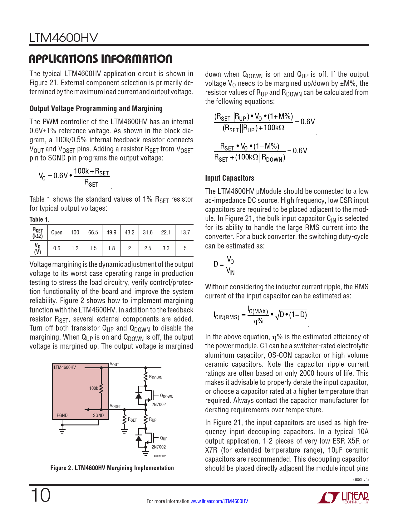LTM4600HV applicaTions inForMaTion The typical LTM4600HV application circuit is shown in down when QDOWN is on and QUP is off. If the output Figure 21. External component selection is primarily de- voltage VO needs to be margined up/down by ±M%, the termined by the maximum load current and output voltage. resistor values of RUP and RDOWN can be calculated from the following equations: Output Voltage Programming and Margining (RSET RUP)• VO •(1+M%) The PWM controller of the LTM4600HV has an internal = 0.6V 0.6V±1% reference voltage. As shown in the block dia- (RSET RUP)+100kΩ gram, a 100k/0.5% internal feedback resistor connects R V SET • VO • (1– M%) OUT and VOSET pins. Adding a resistor RSET from VOSET = 0.6V pin to SGND pin programs the output voltage: RSET +(100kΩ RDOWN) 100k V +RSET O = 0.6V • Input Capacitors RSET The LTM4600HV µModule should be connected to a low Table 1 shows the standard values of 1% RSET resistor ac-impedance DC source. High frequency, low ESR input for typical output voltages: capacitors are required to be placed adjacent to the mod- Table 1. ule. In Figure 21, the bulk input capacitor CIN is selected R for its ability to handle the large RMS current into the SET(k Ω ) Open 100 66.5 49.9 43.2 31.6 22.1 13.7 converter. For a buck converter, the switching duty-cycle VO can be estimated as: (V) 0.6 1.2 1.5 1.8 2 2.5 3.3 5 V Voltage margining is the dynamic adjustment of the output D = O voltage to its worst case operating range in production VIN testing to stress the load circuitry, verify control/protec- Without considering the inductor current ripple, the RMS tion functionality of the board and improve the system current of the input capacitor can be estimated as: reliability. Figure 2 shows how to implement margining function with the LTM4600HV. In addition to the feedback I I O(MAX) CIN(RMS) = • D •(1−D) resistor RSET, several external components are added. η% Turn off both transistor QUP and QDOWN to disable the margining. When QUP is on and QDOWN is off, the output In the above equation, η% is the estimated efficiency of voltage is margined up. The output voltage is margined the power module. C1 can be a switcher-rated electrolytic aluminum capacitor, OS-CON capacitor or high volume VOUT ceramic capacitors. Note the capacitor ripple current LTM4600HV ratings are often based on only 2000 hours of life. This RDOWN makes it advisable to properly derate the input capacitor, 100k or choose a capacitor rated at a higher temperature than QDOWN required. Always contact the capacitor manufacturer for VOSET 2N7002 derating requirements over temperature. PGND SGND RSET RUP In Figure 21, the input capacitors are used as high fre- quency input decoupling capacitors. In a typical 10A QUP output application, 1-2 pieces of very low ESR X5R or 2N7002 X7R (for extended temperature range), 10µF ceramic 4600hv F02 capacitors are recommended. This decoupling capacitor Figure 2. LTM4600HV Margining Implementation should be placed directly adjacent the module input pins 4600hvfe 10 For more information www.linear.com/LTM4600HV Document Outline Features Applications Typical Application Description Absolute Maximum Ratings Pin Configuration Order Information Electrical Characteristics Typical Performance Characteristics Pin Functions Simplified Block Diagram Decoupling Requirements Operation Applications Information Typical Applications Package Description Revision History Typical Application Related Parts