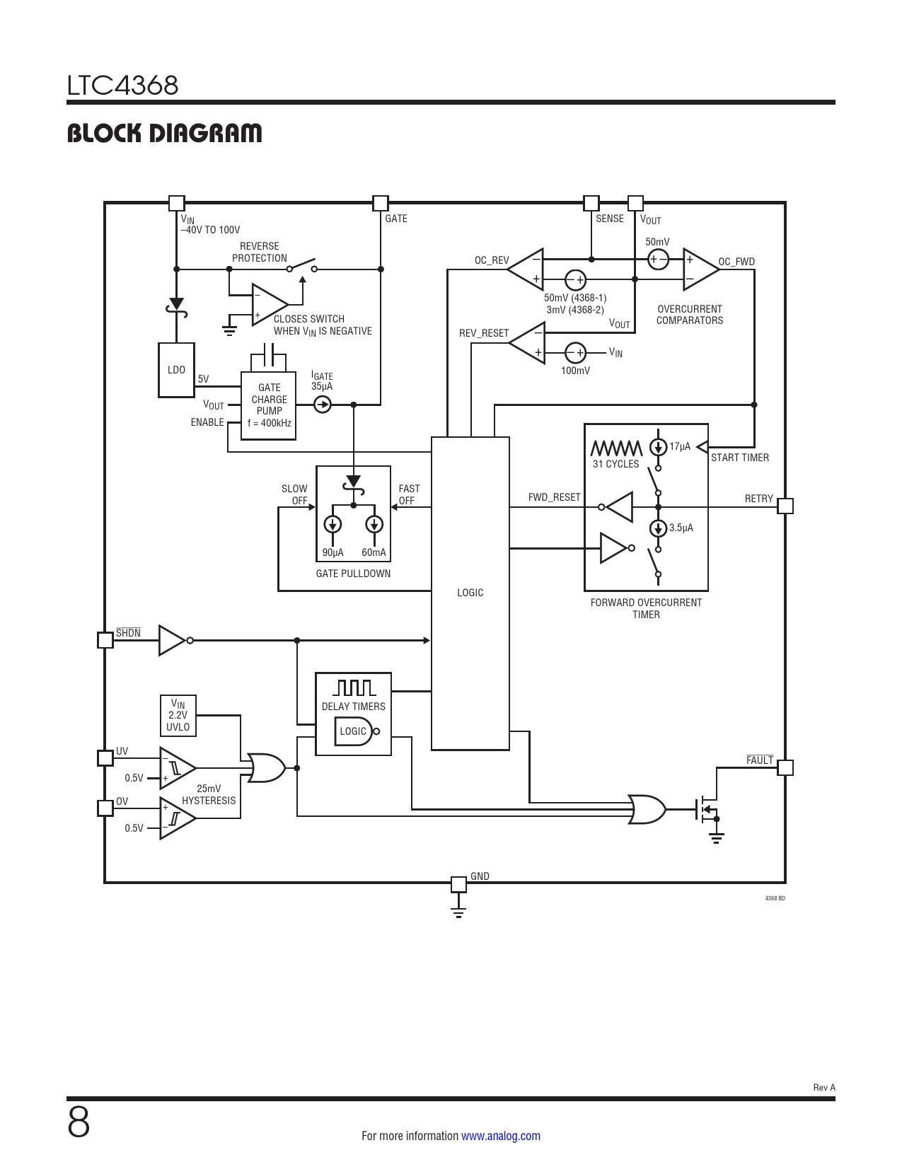 VIN GATE SENSE VOUT –40V TO 100V REVERSE – + – 50mV PROTECTION OC_REV + OC_FWD + – + – – 50mV (4368-1) + 3mV (4368-2) OVERCURRENT CLOSES SWITCH V COMPARATORS – WHEN V OUT IN IS NEGATIVE REV_RESET + – + VIN LDO 100mV 5V IGATE GATE 35µA V CHARGE OUT PUMP ENABLE f = 400kHz 17µA START TIMER 31 CYCLES SLOW FAST OFF OFF FWD_RESET RETRY 3.5µA 90µA 60mA GATE PULLDOWN LOGIC FORWARD OVERCURRENT TIMER SHDN VIN DELAY TIMERS 2.2V UVLO LOGIC UV – FAULT 0.5V + 25mV OV HYSTERESIS + 0.5V – GND 4368 BD Rev A 8 For more information www.analog.com Document Outline Features Applications Description Typical Application Absolute Maximum Ratings Pin Configuration Order Information Pin Functions Block Diagram Applications Information Related Parts Features Applications Typical Application Description Absolute Maximum Ratings Pin Configuration Order Information Electrical Characteristics Pin Functions Block Diagram Operation Applications Information Package Description Revision History Typical Application Related Parts