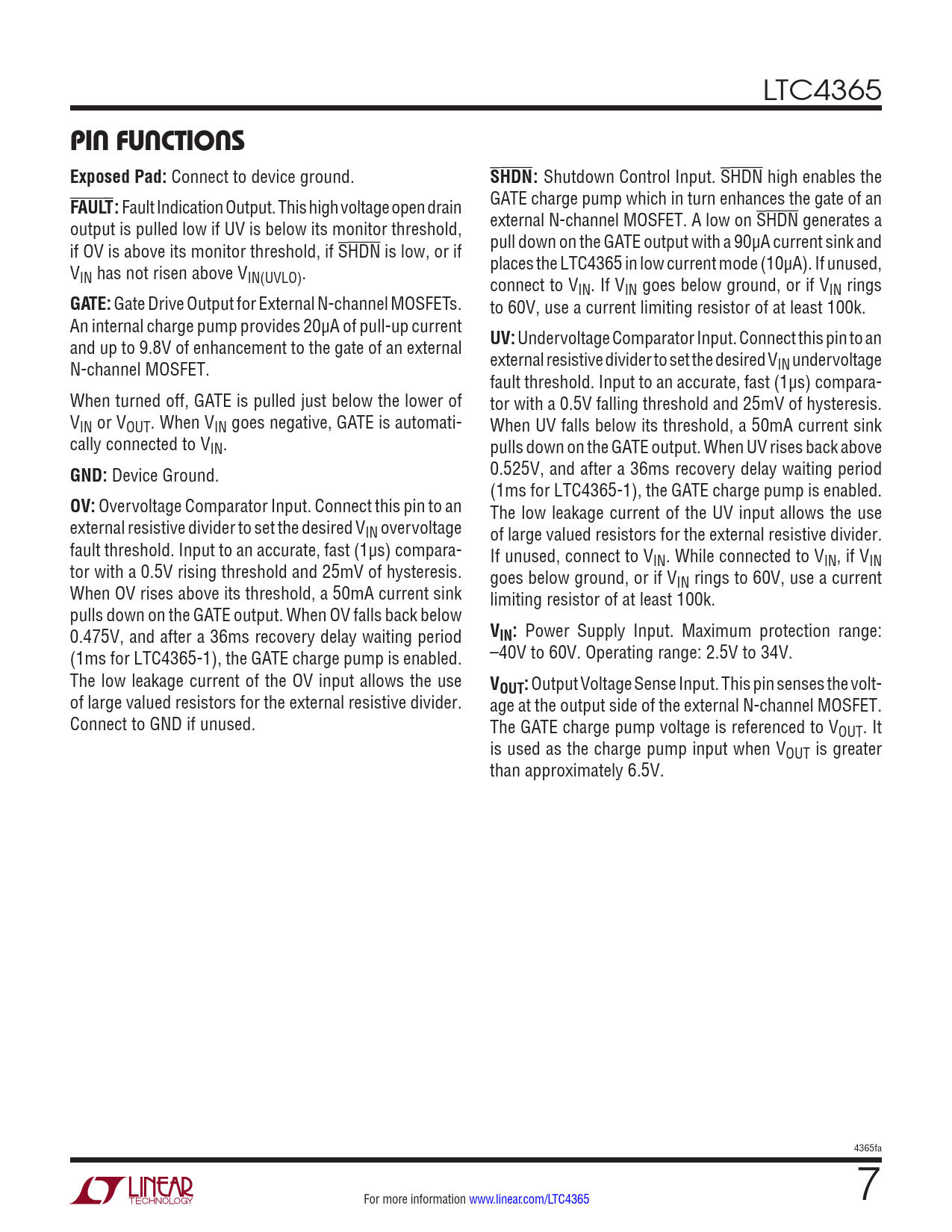 Seiten / Seite20 / 7 — pin FuncTions Exposed Pad:. SHDN:. FAULT:. GATE:. UV:. GND:. OV:. VIN:. …