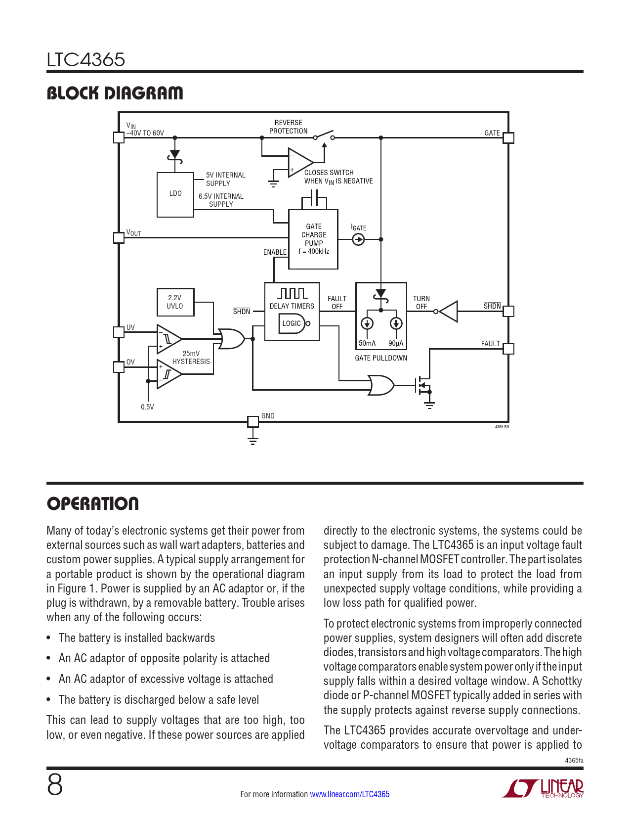 V REVERSE IN –40V TO 60V PROTECTION GATE – + 5V INTERNAL CLOSES SWITCH SUPPLY WHEN VIN IS NEGATIVE LDO 6.5V INTERNAL SUPPLY GATE IGATE VOUT CHARGE PUMP ENABLE f = 400kHz 2.2V FAULT TURN UVLO DELAY TIMERS OFF OFF SHDN SHDN UV LOGIC – + 50mA 90µA FAULT 25mV OV HYSTERESIS GATE PULLDOWN + – 0.5V GND 4365 BD