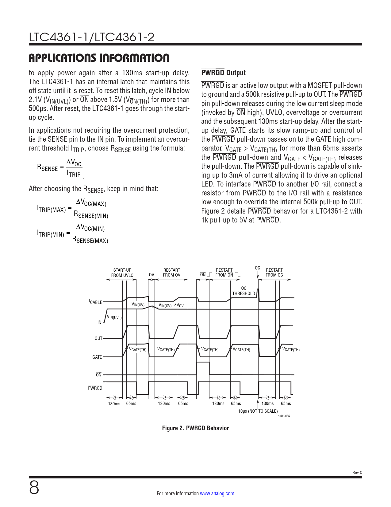 link to page 8 LTC4361-1/LTC4361-2 APPLICATIONS INFORMATION to apply power again after a 130ms start-up delay. PWRGD Output The LTC4361-1 has an internal latch that maintains this PWRGD is an active low output with a MOSFET pull-down off state until it is reset. To reset this latch, cycle IN below to ground and a 500k resistive pull-up to OUT. The PWRGD 2.1V (VIN(UVL)) or ON above 1.5V (VON(TH)) for more than pin pul -down releases during the low current sleep mode 500µs. After reset, the LTC4361-1 goes through the start- (invoked by ON high), UVLO, overvoltage or overcurrent up cycle. and the subsequent 130ms start-up delay. After the start- In applications not requiring the overcurrent protection, up delay, GATE starts its slow ramp-up and control of tie the SENSE pin to the IN pin. To implement an overcur- the PWRGD pull-down passes on to the GATE high com- rent threshold ITRIP , choose RSENSE using the formula: parator. VGATE > VGATE(TH) for more than 65ms asserts the PWRGD pull-down and VGATE < VGATE(TH) releases R ∆VOC SENSE = the pull-down. The PWRGD pull-down is capable of sink- ITRIP ing up to 3mA of current allowing it to drive an optional After choosing the R LED. To interface PWRGD to another I/O rail, connect a SENSE, keep in mind that: resistor from PWRGD to the I/O rail with a resistance ∆V low enough to override the internal 500k pull-up to OUT. I OC(MAX) TRIP(MAX) = R Figure 2 details PWRGD behavior for a LTC4361-2 with SENSE(MIN) 1k pull-up to 5V at PWRGD. ∆V I OC(MIN) TRIP(MIN) = R SENSE(MAX) START-UP RESTART RESTART OC RESTART FROM UVLO OV FROM OV ON FROM ON FROM OC OC THRESHOLD ICABLE VIN(OV) VIN(OV)–∆VOV VIN(UVL) IN OUT VGATE(TH) VGATE(TH) VGATE(TH) VGATE(TH) VGATE(TH) GATE ON PWRGD 130ms 65ms 130ms 65ms 130ms 65ms 130ms 65ms 10µs (NOT TO SCALE) 436112 F02 Figure 2. PWRGD Behavior Rev C 8 For more information www.analog.com Document Outline Features Applications Typical Application Description Absolute Maximum Ratings Pin Configuration Order Information Electrical Characteristics Typical Performance Characteristics Pin Functions Block Diagram Operation Applications Information Package Description Revision History Typical Application Related Parts