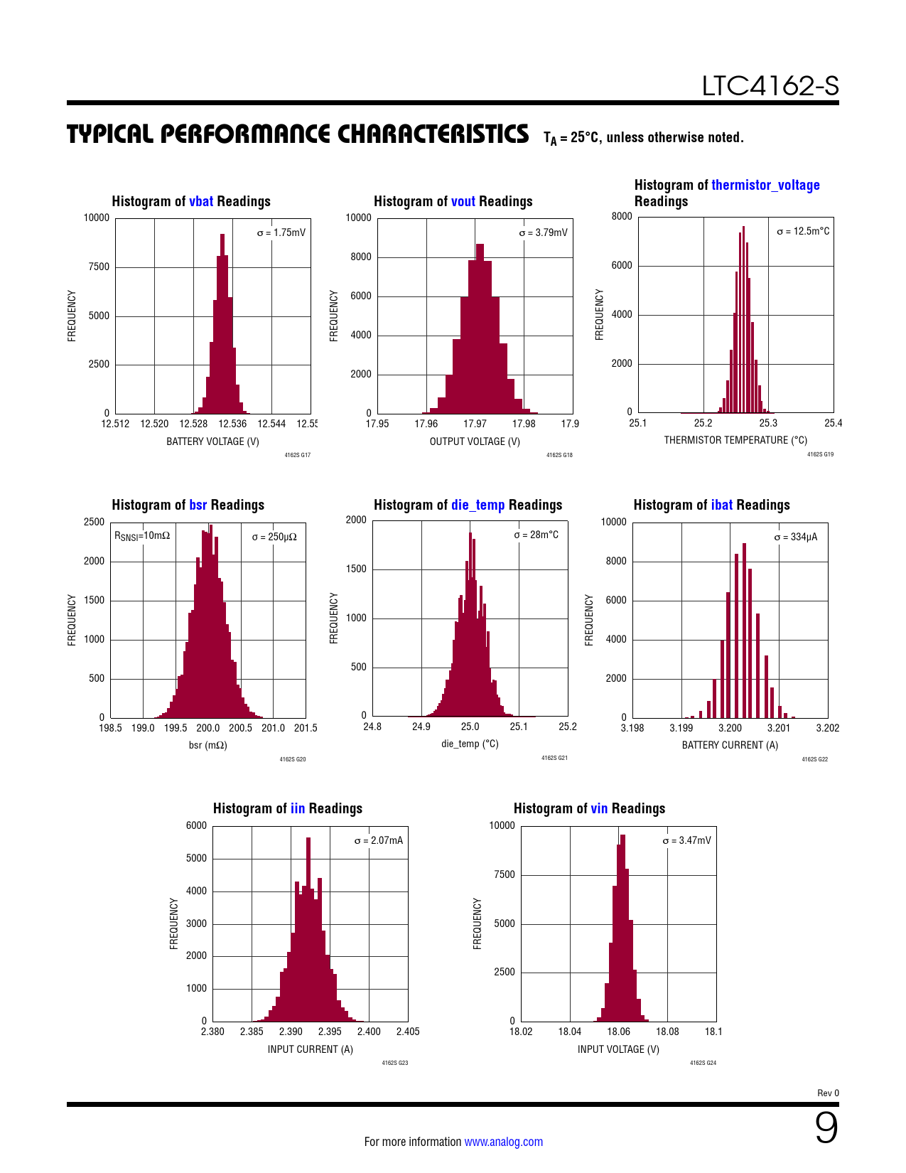 10000 10000 8000 σ = 1.75mV σ = 3.79mV σ = 12.5m°C 8000 7500 6000 6000 5000 4000 FREQUENCY 4000 FREQUENCY FREQUENCY 2500 2000 2000 0 0 0 12.512 12.520 12.528 12.536 12.544 12.552 17.95 17.96 17.97 17.98 17.99 25.1 25.2 25.3 25.4 BATTERY VOLTAGE (V) OUTPUT VOLTAGE (V) THERMISTOR TEMPERATURE (°C) 4162S G17 4162S G18 4162S G19
