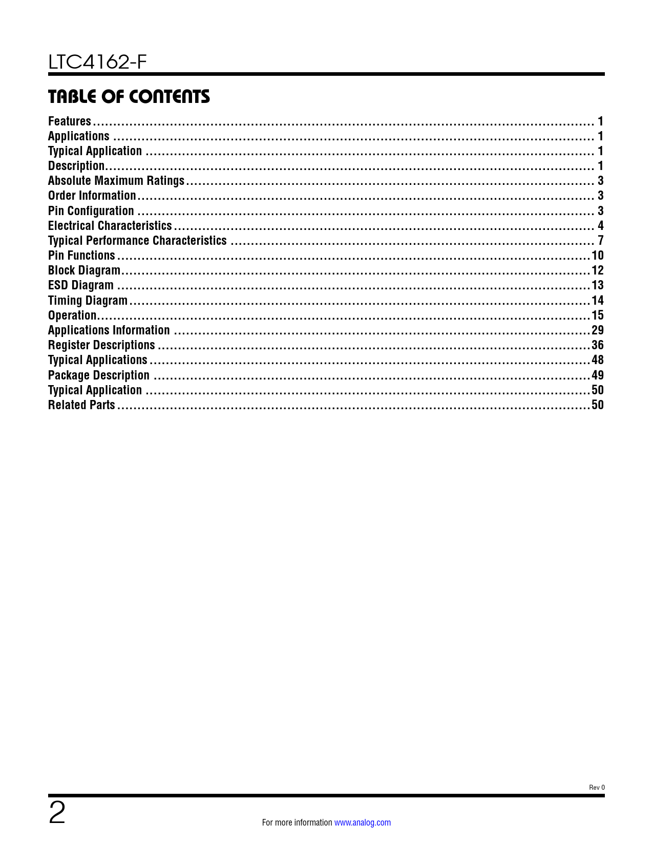 link to page 1 link to page 1 link to page 1 link to page 1 link to page 3 link to page 3 link to page 3 link to page 4 link to page 7 link to page 10 link to page 12 link to page 13 link to page 14 link to page 15 link to page 29 link to page 36 link to page 48 link to page 49 link to page 50 link to page 50 LTC4162-F TABLE OF CONTENTS Features .. 1Applications ... 1Typical Application ... 1Description... 1Absolute Maximum Ratings ... 3Order Information ... 3Pin Configuration ... 3Electrical Characteristics .. 4Typical Performance Characteristics .. 7Pin Functions ...10Block Diagram ..12ESD Diagram ...13Timing Diagram ..14Operation..15Applications Information ...29Register Descriptions ...36Typical Applications ...48Package Description ..49Typical Application ..50Related Parts ...50 Rev 0 2 For more information www.analog.com Document Outline Features Applications Typical Application Description Absolute Maximum Ratings Order Information Pin Configuration Electrical Characteristics Typical Performance Characteristics Pin Functions Block Diagram ESD Diagram Timing Diagram Operation Applications Information Register Descriptions Typical Applications Package Description Typical Application Related Parts