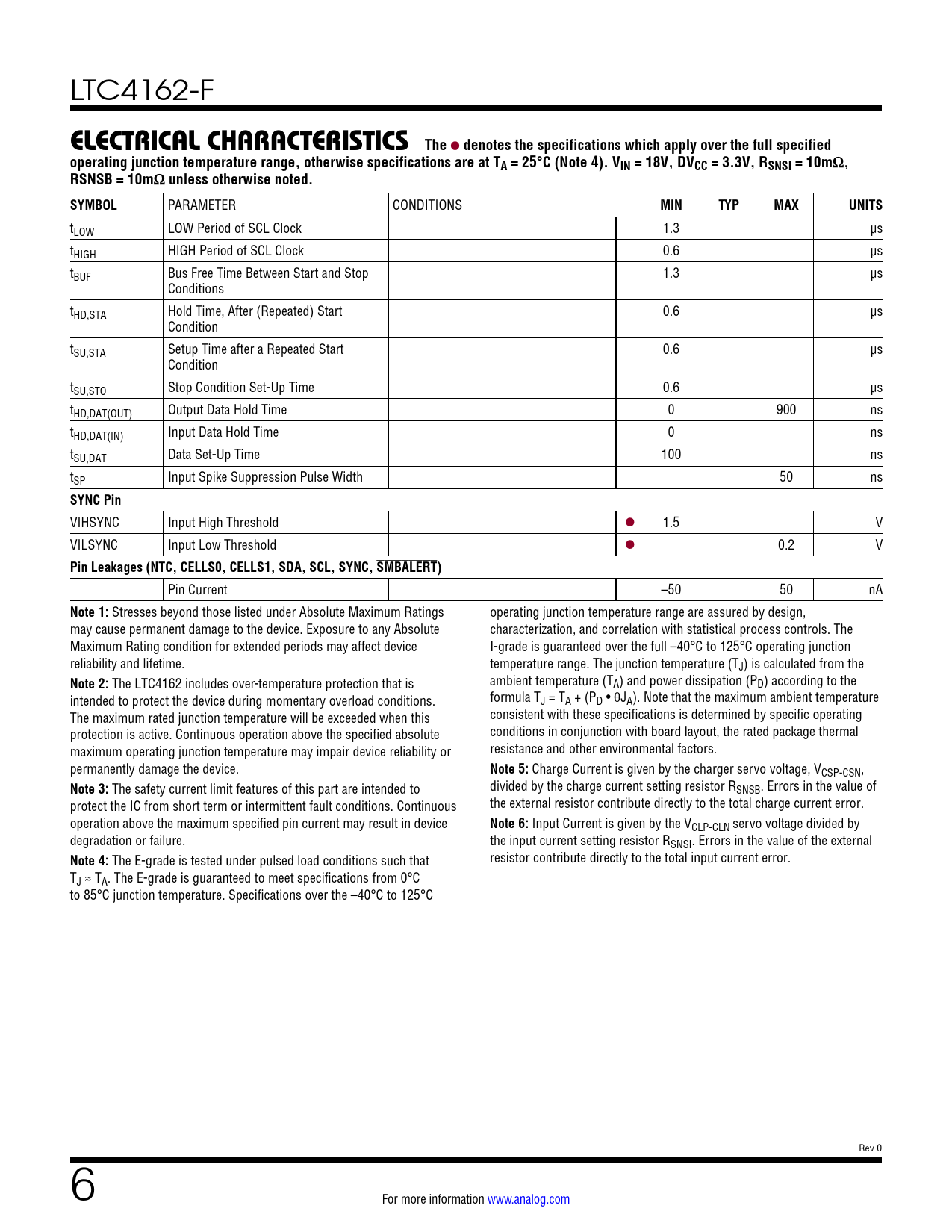 LTC4162-F ELECTRICAL CHARACTERISTICS The l denotes the specifications which apply over the full specifiedoperating junction temperature range, otherwise specifications are at TA = 25°C (Note 4). VIN = 18V, DVCC = 3.3V, RSNSI = 10mΩ,RSNSB = 10mΩ unless otherwise noted. SYMBOL PARAMETER CONDITIONS MINTYPMAXUNITS tLOW LOW Period of SCL Clock 1.3 µs tHIGH HIGH Period of SCL Clock 0.6 µs tBUF Bus Free Time Between Start and Stop 1.3 µs Conditions tHD,STA Hold Time, After (Repeated) Start 0.6 µs Condition tSU,STA Setup Time after a Repeated Start 0.6 µs Condition tSU,STO Stop Condition Set-Up Time 0.6 µs tHD,DAT(OUT) Output Data Hold Time 0 900 ns tHD,DAT(IN) Input Data Hold Time 0 ns tSU,DAT Data Set-Up Time 100 ns tSP Input Spike Suppression Pulse Width 50 ns SYNC Pin VIHSYNC Input High Threshold l 1.5 V VILSYNC Input Low Threshold l 0.2 V Pin Leakages (NTC, CELLS0, CELLS1, SDA, SCL, SYNC, SMBALERT) Pin Current –50 50 nA Note 1: Stresses beyond those listed under Absolute Maximum Ratings operating junction temperature range are assured by design, may cause permanent damage to the device. Exposure to any Absolute characterization, and correlation with statistical process controls. The Maximum Rating condition for extended periods may affect device I-grade is guaranteed over the full –40°C to 125°C operating junction reliability and lifetime. temperature range. The junction temperature (TJ) is calculated from the Note 2: The LTC4162 includes over-temperature protection that is ambient temperature (TA) and power dissipation (PD) according to the intended to protect the device during momentary overload conditions. formula TJ = TA + (PD • θJA). Note that the maximum ambient temperature The maximum rated junction temperature will be exceeded when this consistent with these specifications is determined by specific operating protection is active. Continuous operation above the specified absolute conditions in conjunction with board layout, the rated package thermal maximum operating junction temperature may impair device reliability or resistance and other environmental factors. permanently damage the device. Note 5: Charge Current is given by the charger servo voltage, VCSP-CSN, Note 3: The safety current limit features of this part are intended to divided by the charge current setting resistor RSNSB. Errors in the value of protect the IC from short term or intermittent fault conditions. Continuous the external resistor contribute directly to the total charge current error. operation above the maximum specified pin current may result in device Note 6: Input Current is given by the VCLP-CLN servo voltage divided by degradation or failure. the input current setting resistor RSNSI. Errors in the value of the external Note 4: The E-grade is tested under pulsed load conditions such that resistor contribute directly to the total input current error. TJ ≈ TA. The E-grade is guaranteed to meet specifications from 0°C to 85°C junction temperature. Specifications over the –40°C to 125°C Rev 0 6 For more information www.analog.com Document Outline Features Applications Typical Application Description Absolute Maximum Ratings Order Information Pin Configuration Electrical Characteristics Typical Performance Characteristics Pin Functions Block Diagram ESD Diagram Timing Diagram Operation Applications Information Register Descriptions Typical Applications Package Description Typical Application Related Parts