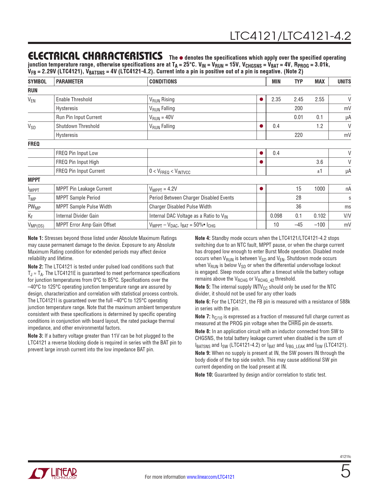 LTC4121/LTC4121-4.2 ELECTRICAL CHARACTERISTICSThe l denotes the specifications which apply over the specified operatingjunction temperature range, otherwise specifications are at TA = 25°C. VIN = VRUN = 15V, VCHGSNS = VBAT = 4V, RPROG = 3.01k,VFB = 2.29V (LTC4121), VBATSNS = 4V (LTC4121-4.2). Current into a pin is positive out of a pin is negative. (Note 2) SYMBOLPARAMETERCONDITIONSMINTYPMAXUNITSRUN VEN Enable Threshold VRUN Rising l 2.35 2.45 2.55 V Hysteresis VRUN Falling 200 mV Run Pin Input Current VRUN = 40V 0.01 0.1 µA VSD Shutdown Threshold VRUN Falling l 0.4 1.2 V Hysteresis 220 mV FREQ FREQ Pin Input Low l 0.4 V FREQ Pin Input High l 3.6 V FREQ Pin Input Current 0 < VFREQ < VINTVCC ±1 µA MPPT IMPPT MPPT Pin Leakage Current VMPPT = 4.2V l 15 1000 nA TMP MPPT Sample Period Period Between Charger Disabled Events 28 s PWMP MPPT Sample Pulse Width Charger Disabled Pulse Width 36 ms KF Internal Divider Gain Internal DAC Voltage as a Ratio to VIN 0.098 0.1 0.102 V/V VMP(OS) MPPT Error Amp Gain Offset VMPPT – VDAC, IBAT = 50%• ICHG 10 –45 –100 mV Note 1: Stresses beyond those listed under Absolute Maximum Ratings Note 4: Standby mode occurs when the LTC4121/LTC4121-4.2 stops may cause permanent damage to the device. Exposure to any Absolute switching due to an NTC fault, MPPT pause, or when the charge current Maximum Rating condition for extended periods may affect device has dropped low enough to enter Burst Mode operation. Disabled mode reliability and lifetime. occurs when VRUN is between VSD and VEN. Shutdown mode occurs Note 2: The LTC4121 is tested under pulsed load conditions such that when VRUN is below VSD or when the differential undervoltage lockout T is engaged. Sleep mode occurs after a timeout while the battery voltage J ≈ TA. The LTC4121E is guaranteed to meet performance specifications for junction temperatures from 0°C to 85°C. Specifications over the remains above the VRCHG or VRCHG_42 threshold. –40°C to 125°C operating junction temperature range are assured by Note 5: The internal supply INTVCC should only be used for the NTC design, characterization and correlation with statistical process controls. divider, it should not be used for any other loads The LTC4121I is guaranteed over the full –40°C to 125°C operating Note 6: For the LTC4121, the FB pin is measured with a resistance of 588k junction temperature range. Note that the maximum ambient temperature in series with the pin. consistent with these specifications is determined by specific operating Note 7: h conditions in conjunction with board layout, the rated package thermal C/10 is expressed as a fraction of measured full charge current as measured at the PROG pin voltage when the CHRG pin de-asserts. impedance, and other environmental factors. Note 8: In an application circuit with an inductor connected from SW to Note 3: If a battery voltage greater than 11V can be hot plugged to the CHGSNS, the total battery leakage current when disabled is the sum of LTC4121 a reverse blocking diode is required in series with the BAT pin to I prevent large inrush current into the low impedance BAT pin. BATSNS and ISW (LTC4121-4.2) or IBAT and IFBG_LEAK and ISW (LTC4121). Note 9: When no supply is present at IN, the SW powers IN through the body diode of the top side switch. This may cause additional SW pin current depending on the load present at IN. Note 10: Guaranteed by design and/or correlation to static test. 4121fc For more information www.linear.com/LTC4121 5 Document Outline Features Applications Typical Application Description Absolute Maximum Ratings Pin Configuration Order Information Electrical Characteristics Typical Performance Characteristics Pin Functions Block Diagram Operation Applications Information Applications Examples Package Description Typical Application Related Parts