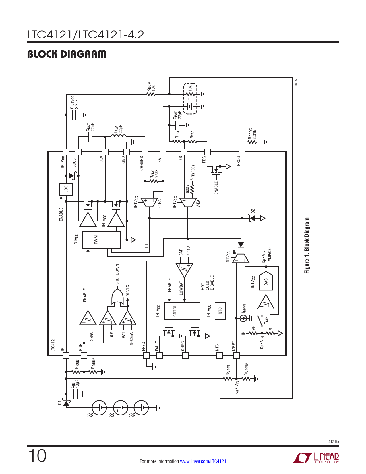LTC4121/LTC4121-4.2 BLOCK DIAGRAM 4121 F01 R NOM 10k 10k T VCC C INT 2.2µF C BAT 22µF C BST 22nF L SW 22µH R FB1 R FB2 R PROG 3.01k V CC SW BAT FB GND FBG INT BOOST PROG CHGSNS R SNS 0.3Ω V FB(REG) LDO 588k ENABLE V CC + – V CC + – INT C-EA INT V-EA DZ ENABLE V CC INT M V CC Diagram PW INT I TH Block BAT 2.21V IN V CC gm • V MP(OS) 1. INT + – – + K F +V Figure SHUTDOWN T V CC DAC INT ENABLE HOT COLD DISABLE DUVLC LOWBA ENABLE T + – V CC V CC NTC I MPP INT CNTRL INT + – + – + – T MP 9R R 0.9 IN BAT 2.45V IN T T IN-80mV • V LTC4121 IN RUN FREQ FAUL CHRG NTC MPP K F T1 T2 R RUN1 R RUN2 R MPP R MPP IN C IN 10µF • V K R D1 + + + 4121fc 10 For more information www.linear.com/LTC4121 Document Outline Features Applications Typical Application Description Absolute Maximum Ratings Pin Configuration Order Information Electrical Characteristics Typical Performance Characteristics Pin Functions Block Diagram Operation Applications Information Applications Examples Package Description Typical Application Related Parts