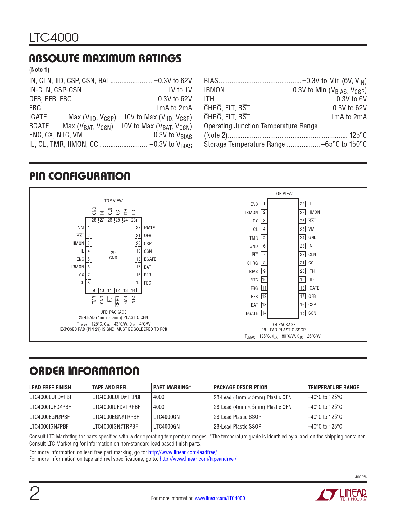 TOP VIEW TOP VIEW ENC 1 28 IL GND IN CLN CC ITH IID IBMON 2 27 IIMON 28 27 26 25 24 23 CX 3 26 RST VM 1 22 IGATE CL 4 25 VM RST 2 21 OFB TMR 5 24 GND IIMON 3 20 CSP GND 6 23 IN IL 4 29 19 CSN FLT 7 22 CLN GND ENC 5 18 BGATE CHRG 8 21 CC IBMON 6 17 BAT BIAS 9 20 ITH CX 7 16 BFB NTC 10 19 IID CL 8 15 FBG 9 10 11 12 13 14 FBG 11 18 IGATE BFB 12 17 OFB TMR GND FLT CHRG BIAS NTC BAT 13 16 CSP UFD PACKAGE BGATE 14 15 CSN 28-LEAD (4mm × 5mm) PLASTIC QFN TJMAX = 125°C, θJA = 43°C/W, θJC = 4°C/W GN PACKAGE EXPOSED PAD (PIN 29) IS GND, MUST BE SOLDERED TO PCB 28-LEAD PLASTIC SSOP TJMAX = 125°C, θJA = 80°C/W, θJC = 25°C/W