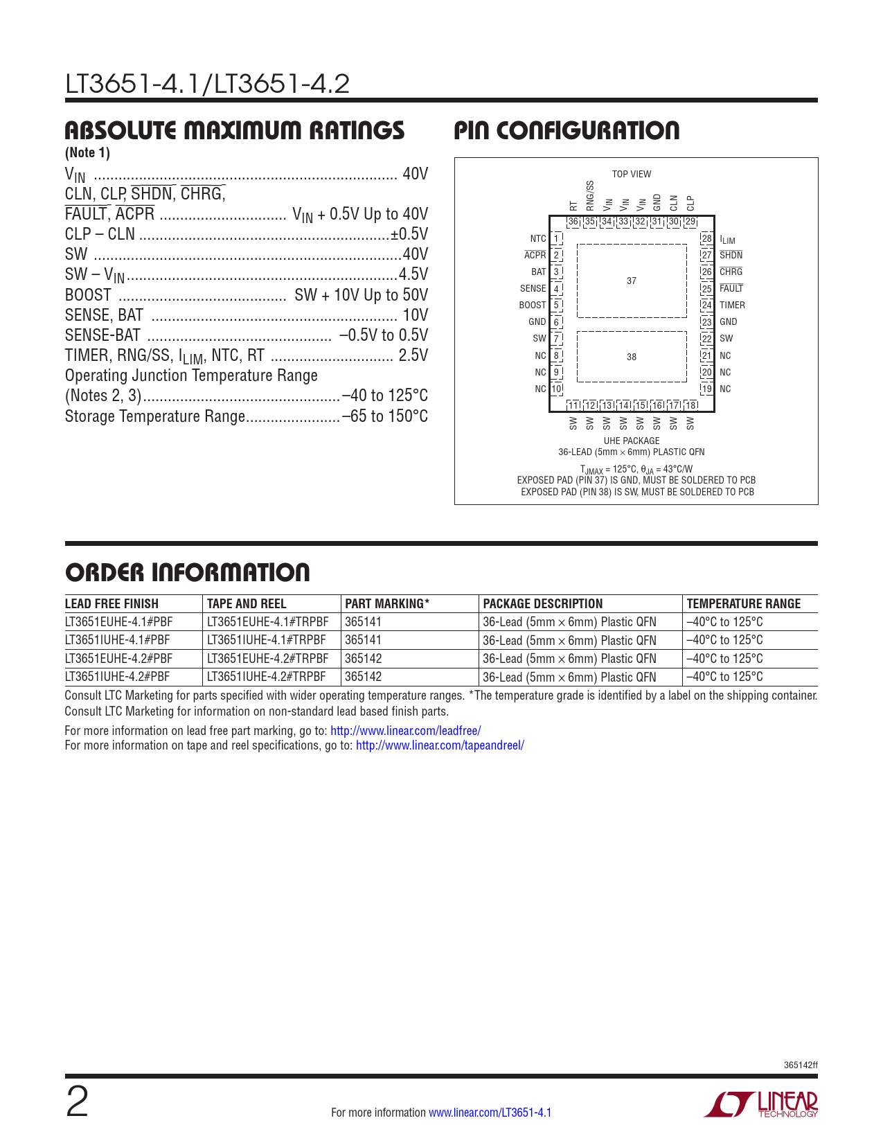 LT3651-4.1/LT3651-4.2 ABSOLUTE MAXIMUM RATINGSPIN CONFIGURATION(Note 1) V TOP VIEW IN .. 40V CLN, CLP, SHDN, CHRG, RT RNG/SS V IN V IN V IN GND CLN CLP FAULT, ACPR ... VIN + 0.5V Up to 40V 36 35 34 33 32 31 30 29 CLP – CLN ...±0.5V NTC 1 28 ILIM SW ...40V ACPR 2 27 SHDN BAT 3 26 CHRG SW – VIN ..4.5V 37 SENSE 4 25 FAULT BOOST ... SW + 10V Up to 50V BOOST 5 24 TIMER SENSE, BAT .. 10V GND 6 23 GND SENSE-BAT ... –0.5V to 0.5V SW 7 22 SW TIMER, RNG/SS, I NC 8 38 21 NC LIM, NTC, RT .. 2.5V NC 9 20 NC Operating Junction Temperature Range NC 10 19 NC (Notes 2, 3) ..–40 to 125°C 11 12 13 14 15 16 17 18 Storage Temperature Range ...–65 to 150°C SW SW SW SW SW SW SW SW UHE PACKAGE 36-LEAD (5mm × 6mm) PLASTIC QFN TJMAX = 125°C, θJA = 43°C/W EXPOSED PAD (PIN 37) IS GND, MUST BE SOLDERED TO PCB EXPOSED PAD (PIN 38) IS SW, MUST BE SOLDERED TO PCB ORDER INFORMATION LEAD FREE FINISHTAPE AND REELPART MARKING*PACKAGE DESCRIPTIONTEMPERATURE RANGE LT3651EUHE-4.1#PBF LT3651EUHE-4.1#TRPBF 365141 36-Lead (5mm × 6mm) Plastic QFN –40°C to 125°C LT3651IUHE-4.1#PBF LT3651IUHE-4.1#TRPBF 365141 36-Lead (5mm × 6mm) Plastic QFN –40°C to 125°C LT3651EUHE-4.2#PBF LT3651EUHE-4.2#TRPBF 365142 36-Lead (5mm × 6mm) Plastic QFN –40°C to 125°C LT3651IUHE-4.2#PBF LT3651IUHE-4.2#TRPBF 365142 36-Lead (5mm × 6mm) Plastic QFN –40°C to 125°C Consult LTC Marketing for parts specified with wider operating temperature ranges. *The temperature grade is identified by a label on the shipping container. Consult LTC Marketing for information on non-standard lead based finish parts. For more information on lead free part marking, go to: http://www.linear.com/leadfree/ For more information on tape and reel specifications, go to: http://www.linear.com/tapeandreel/ 365142ff 2 For more information www.linear.com/LT3651-4.1 Document Outline Features Description Applications Typical Application Absolute Maximum Ratings Pin Configuration Order Information Pin Functions Block Diagram Operation Applications Information Typical Applications Revision History Typical Application Related Parts