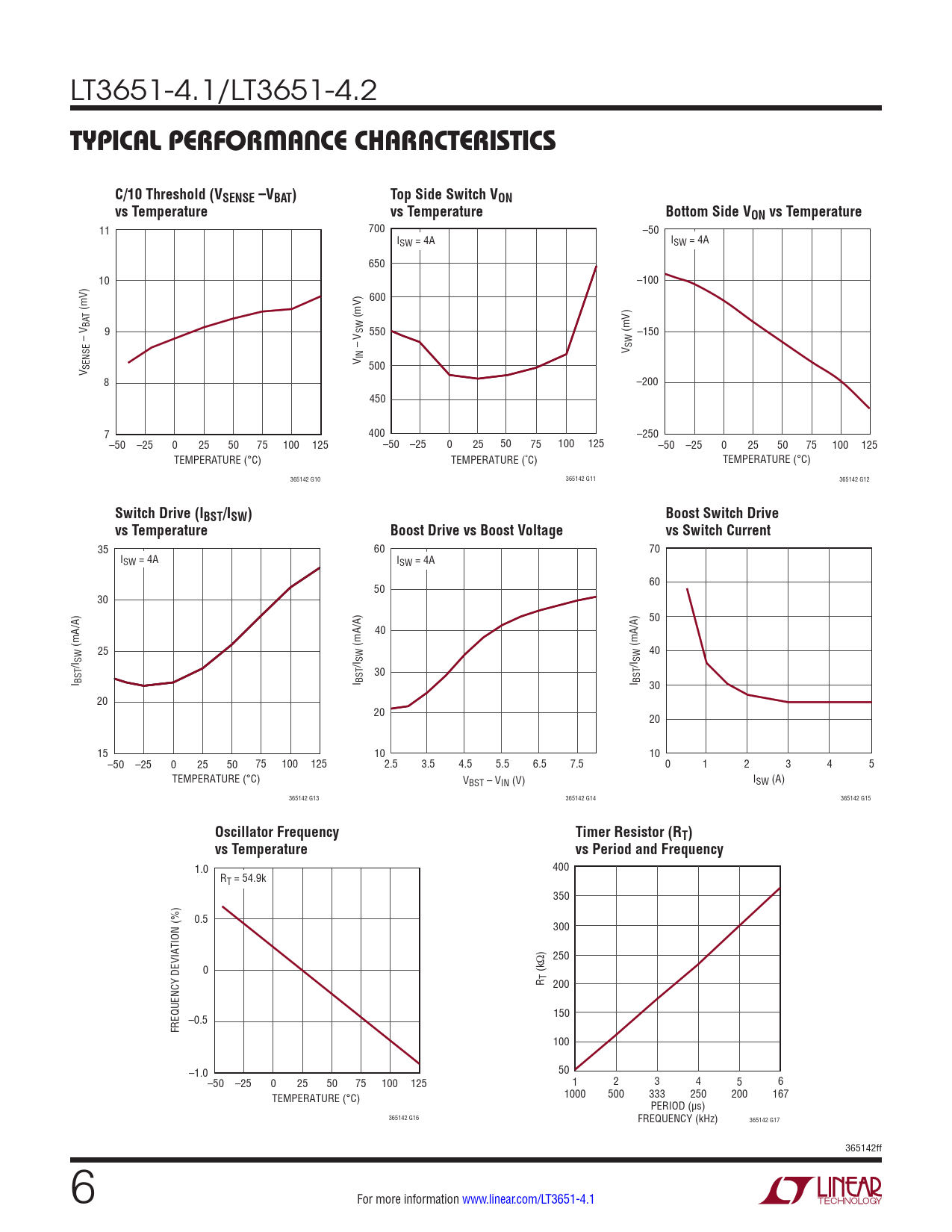 11 700 –50 ISW = 4A ISW = 4A 650 10 –100 600 (mV) (mV) BAT 9 SW 550 (mV) –150 – V – V V SW V IN V SENSE 500 8 –200 450 7 400 –250 –50 –25 0 25 50 75 100 125 –50 –25 0 25 50 75 100 125 –50 –25 0 25 50 75 100 125 TEMPERATURE (°C) TEMPERATURE (˚C) TEMPERATURE (°C) 365142 G10 365142 G11 365142 G12