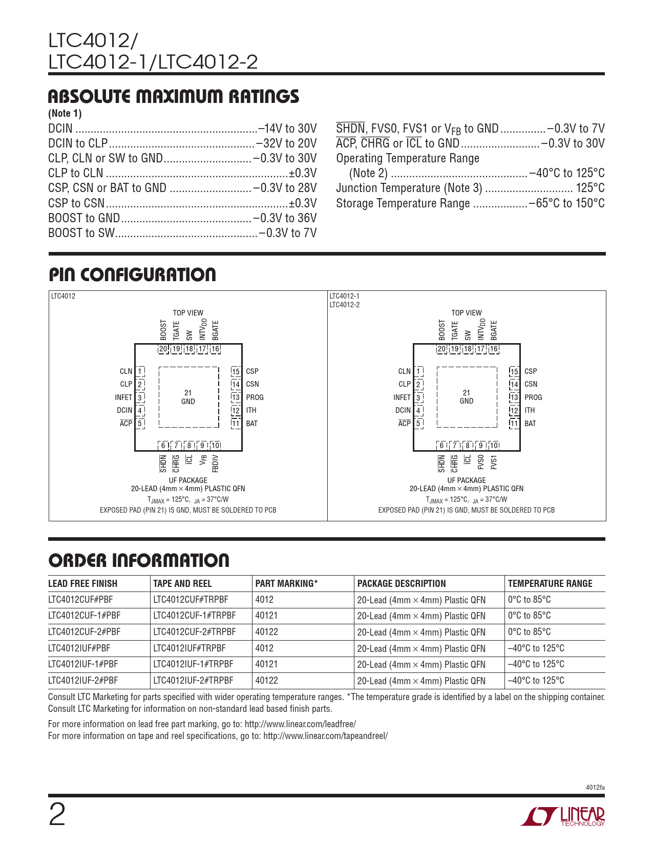 LTC4012CUF#PBF LTC4012CUF#TRPBF 4012 20-Lead (4mm × 4mm) Plastic QFN 0°C to 85°C LTC4012CUF-1#PBF LTC4012CUF-1#TRPBF 40121 20-Lead (4mm × 4mm) Plastic QFN 0°C to 85°C LTC4012CUF-2#PBF LTC4012CUF-2#TRPBF 40122 20-Lead (4mm × 4mm) Plastic QFN 0°C to 85°C LTC4012IUF#PBF LTC4012IUF#TRPBF 4012 20-Lead (4mm × 4mm) Plastic QFN –40°C to 125°C LTC4012IUF-1#PBF LTC4012IUF-1#TRPBF 40121 20-Lead (4mm × 4mm) Plastic QFN –40°C to 125°C LTC4012IUF-2#PBF LTC4012IUF-2#TRPBF 40122 20-Lead (4mm × 4mm) Plastic QFN –40°C to 125°C Consult LTC Marketing for parts specified with wider operating temperature ranges. *The temperature grade is identified by a label on the shipping container. Consult LTC Marketing for information on non-standard lead based finish parts. For more information on lead free part marking, go to: http://www.linear.com/leadfree/ For more information on tape and reel specifications, go to: http://www.linear.com/tapeandreel/ 4012fa Document Outline Features Applications Description Typical Application Absolute Maximum Ratings Pin Configuration Order Information Electrical Characteristics Test Circuits Typical Performance Characteristics Pin Functions Block Diagram Operation Applications Information Package Description Revision History Typical Application Related Parts