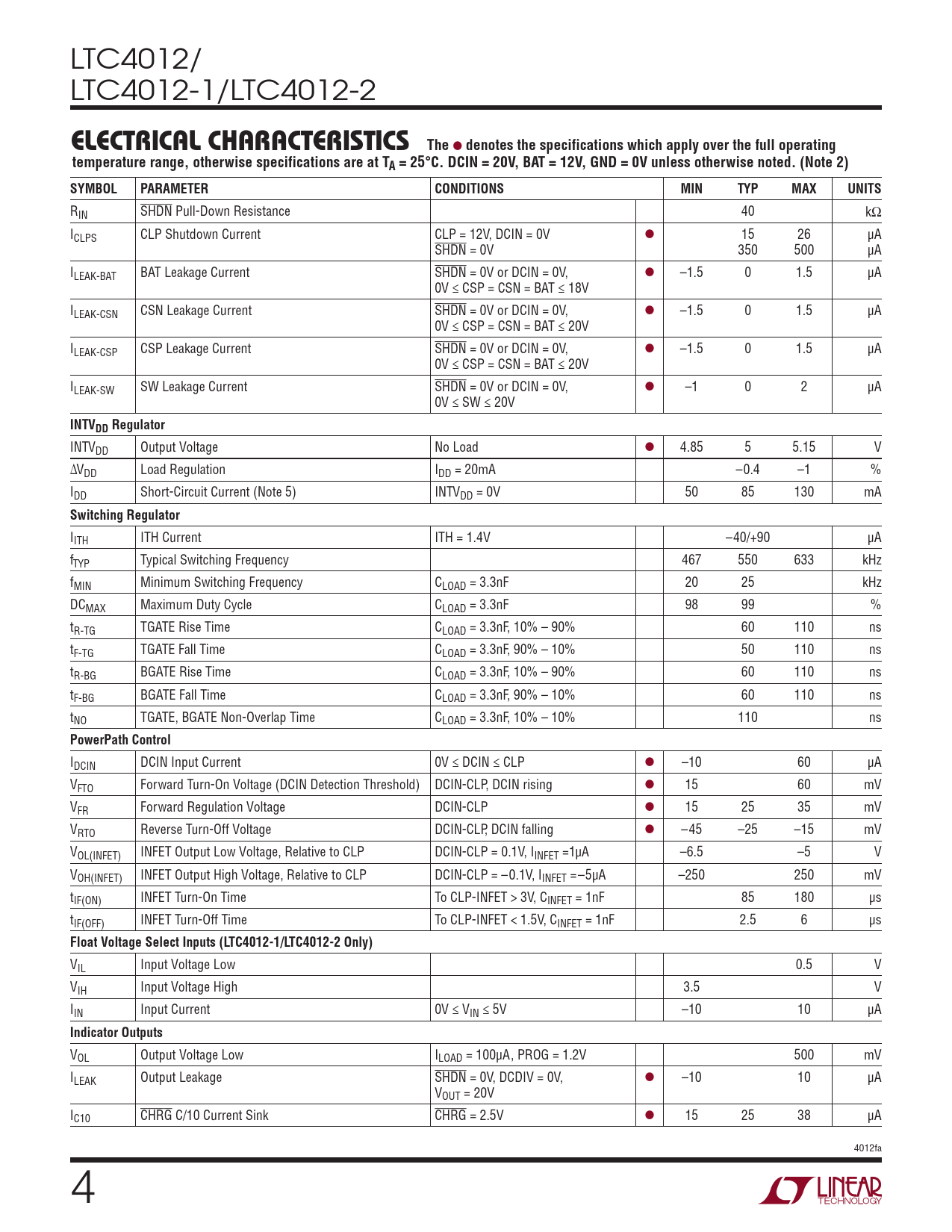 LTC4012/ LTC4012-1/LTC4012-2 e lectrical characteristics