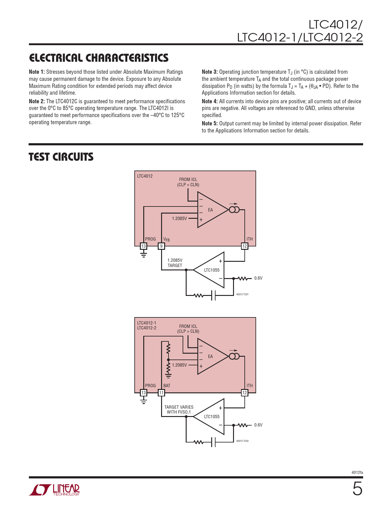 Output current may be limited by internal power dissipation. Refer to the Applications Information section for details. test circuits LTC4012 FROM ICL (CLP = CLN) – – – EA 1.2085V + PROG VFB ITH 13 9 12 1.2085V + TARGET LTC1055 – 0.6V 40012 TC01 LTC4012-1 LTC4012-2 FROM ICL (CLP = CLN) – – – EA 1.2085V + PROG BAT ITH 13 11 12 TARGET VARIES + WITH FVSO,1 LTC1055 – 0.6V 40012 TC02 4012fa Document Outline Features Applications Description Typical Application Absolute Maximum Ratings Pin Configuration Order Information Electrical Characteristics Test Circuits Typical Performance Characteristics Pin Functions Block Diagram Operation Applications Information Package Description Revision History Typical Application Related Parts