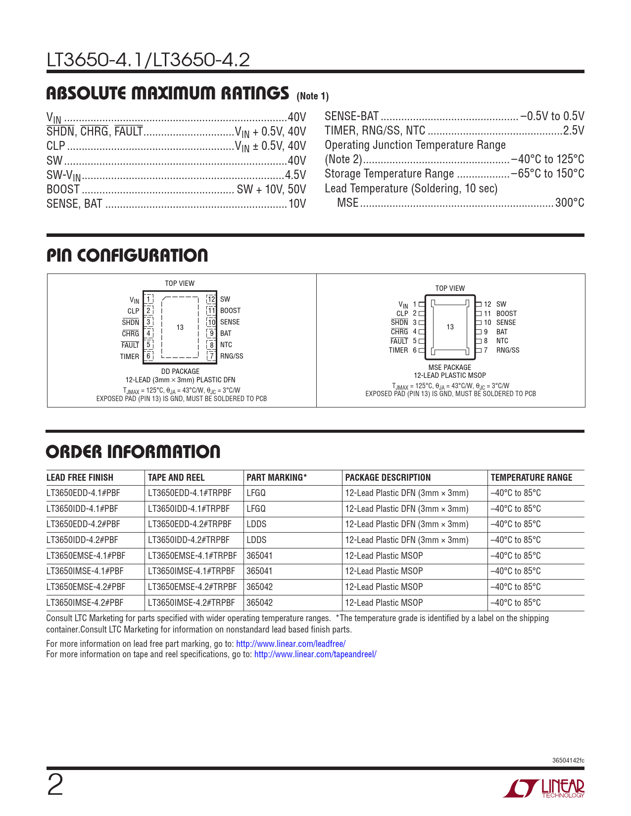 LT3650EDD-4.1#PBF LT3650EDD-4.1#TRPBF LFGQ 12-Lead Plastic DFN (3mm × 3mm) –40°C to 85°C LT3650IDD-4.1#PBF LT3650IDD-4.1#TRPBF LFGQ 12-Lead Plastic DFN (3mm × 3mm) –40°C to 85°C LT3650EDD-4.2#PBF LT3650EDD-4.2#TRPBF LDDS 12-Lead Plastic DFN (3mm × 3mm) –40°C to 85°C LT3650IDD-4.2#PBF LT3650IDD-4.2#TRPBF LDDS 12-Lead Plastic DFN (3mm × 3mm) –40°C to 85°C LT3650EMSE-4.1#PBF LT3650EMSE-4.1#TRPBF 365041 12-Lead Plastic MSOP –40°C to 85°C LT3650IMSE-4.1#PBF LT3650IMSE-4.1#TRPBF 365041 12-Lead Plastic MSOP –40°C to 85°C LT3650EMSE-4.2#PBF LT3650EMSE-4.2#TRPBF 365042 12-Lead Plastic MSOP –40°C to 85°C LT3650IMSE-4.2#PBF LT3650IMSE-4.2#TRPBF 365042 12-Lead Plastic MSOP –40°C to 85°C Consult LTC Marketing for parts specified with wider operating temperature ranges. *The temperature grade is identified by a label on the shipping container.Consult LTC Marketing for information on nonstandard lead based finish parts. For more information on lead free part marking, go to: http://www.linear.com/leadfree/ For more information on tape and reel specifications, go to: http://www.linear.com/tapeandreel/ 36504142fc 2 Document Outline Features Applications Description Typical Application Absolute Maximum Ratings Pin Configuration Order Information Electrical Characteristics Typical Performance Characteristics Pin Functions Block Diagram Operation Applications Information Typical Applications Package Description Revision History Typical Application Related Parts