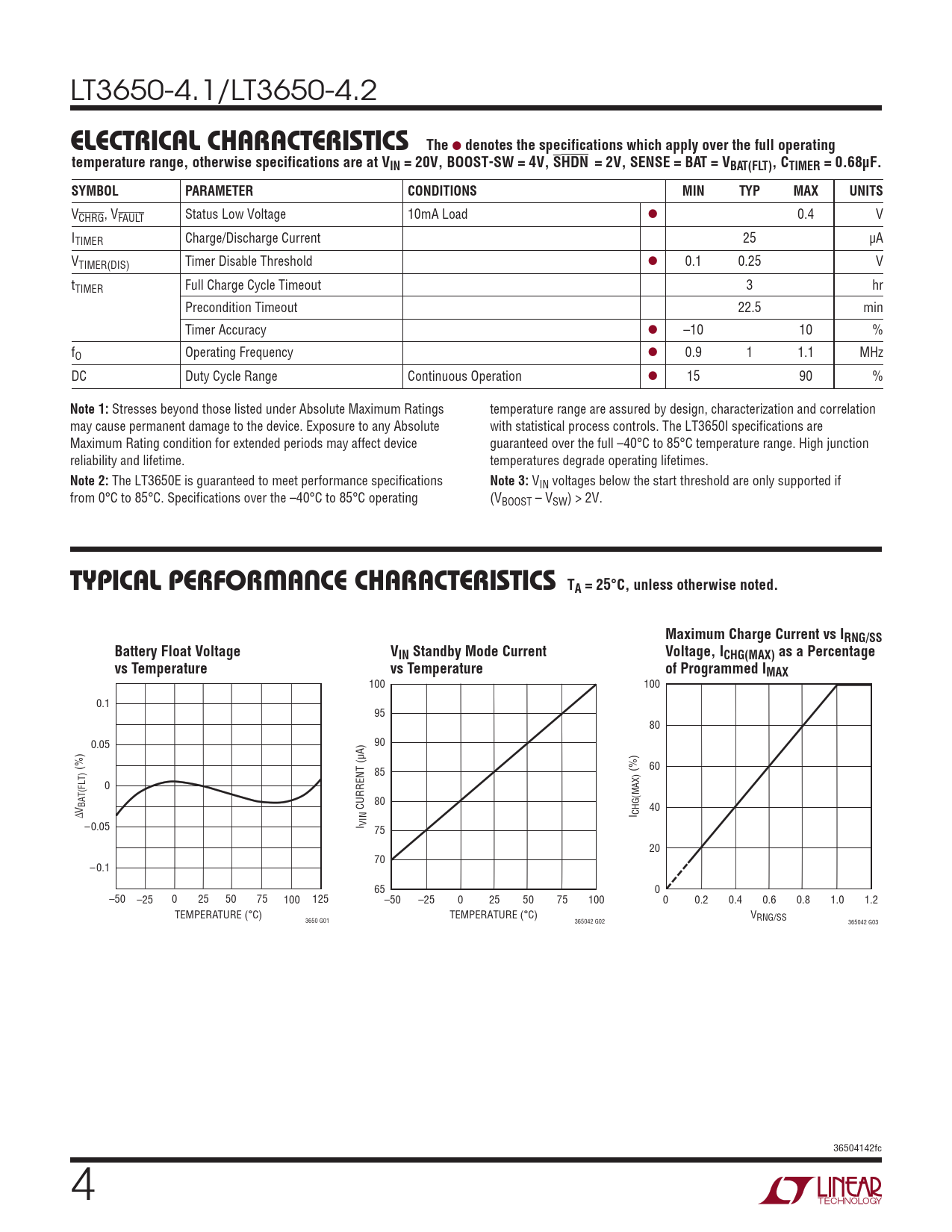 LT3650-4.1/LT3650-4.2 e lecTrical characTerisTics The l denotes the specifications which apply over the full operatingtemperature range, otherwise specifications are at VIN = 20V, BOOST-SW = 4V, SHDN = 2V, SENSE = BAT = VBAT(FLT), CTIMER = 0.68µF. SYMBOLPARAMETERCONDITIONSMINTYPMAXUNITS VCHRG, VFAULT Status Low Voltage 10mA Load l 0.4 V ITIMER Charge/Discharge Current 25 µA VTIMER(DIS) Timer Disable Threshold l 0.1 0.25 V tTIMER Full Charge Cycle Timeout 3 hr Precondition Timeout 22.5 min Timer Accuracy l –10 10 % fO Operating Frequency l 0.9 1 1.1 MHz DC Duty Cycle Range Continuous Operation l 15 90 % Note 1: Stresses beyond those listed under Absolute Maximum Ratings temperature range are assured by design, characterization and correlation may cause permanent damage to the device. Exposure to any Absolute with statistical process controls. The LT3650I specifications are Maximum Rating condition for extended periods may affect device guaranteed over the full –40°C to 85°C temperature range. High junction reliability and lifetime. temperatures degrade operating lifetimes. Note 2: The LT3650E is guaranteed to meet performance specifications Note 3: VIN voltages below the start threshold are only supported if from 0°C to 85°C. Specifications over the –40°C to 85°C operating (VBOOST – VSW) > 2V. Typical perForMance characTerisTics TA = 25°C, unless otherwise noted.Maximum Charge Current vs IRNG/SSBattery Float VoltageVIN Standby Mode CurrentVoltage, ICHG(MAX) as a Percentagevs Temperaturevs Temperatureof Programmed IMAX 100 100 0.1 95 80 0.05 90 (%) 85 (%) 60 0 80 CURRENT (µA) 40 ∆V BAT(FLT) I CHG(MAX) –0.05 I VIN 75 20 70 –0.1 65 0 –50 –25 0 25 50 75 100 125 –50 –25 0 25 50 75 100 0 0.2 0.4 0.6 0.8 1.0 1.2 TEMPERATURE (°C) TEMPERATURE (°C) V 3650 G01 RNG/SS 365042 G02 365042 G03 36504142fc 4 Document Outline Features Applications Description Typical Application Absolute Maximum Ratings Pin Configuration Order Information Electrical Characteristics Typical Performance Characteristics Pin Functions Block Diagram Operation Applications Information Typical Applications Package Description Revision History Typical Application Related Parts