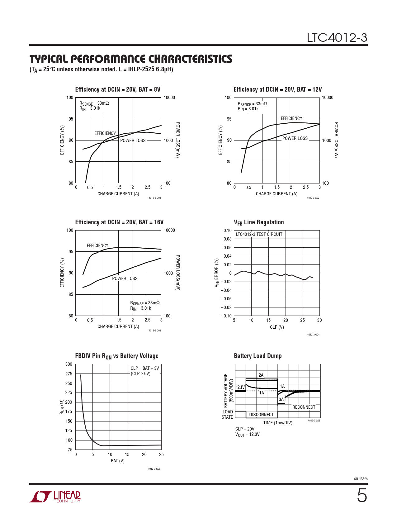 100 10000 0.10 LTC4012-3 TEST CIRCUIT 0.08 EFFICIENCY 0.06 95 POWER LOSS(mW) 0.04 0.02 90 1000 0 POWER LOSS ERROR (%) –0.02 EFFICIENCY (%) V FB –0.04 85 –0.06 RSENSE = 33mΩ RIN = 3.01k –0.08 80 100 –0.10 0 0.5 1 1.5 2 2.5 3 5 10 15 20 25 30 CHARGE CURRENT (A) CLP (V) 4012-3 G03 4012-3 G04