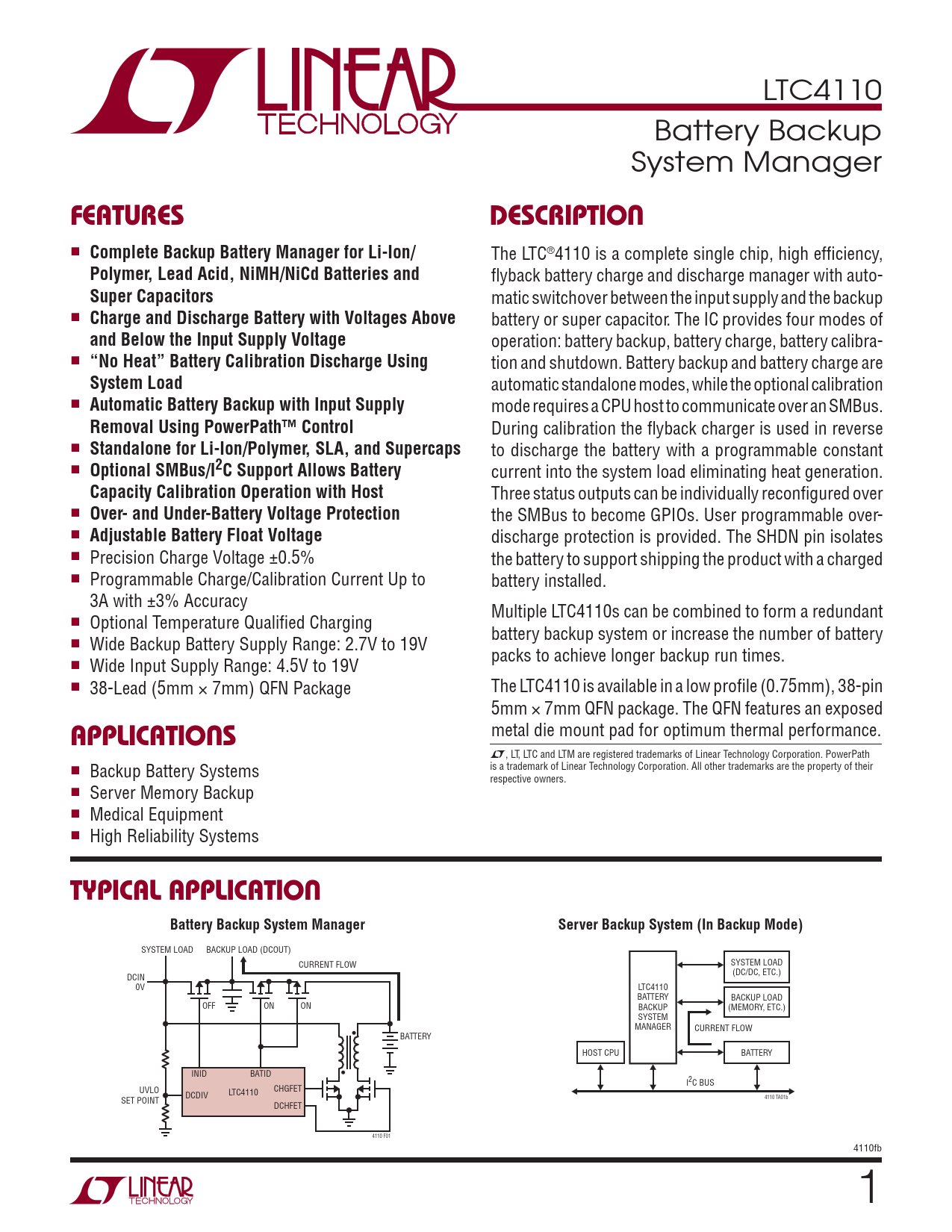 LTC4110 Battery Backup System Manager FEATURESDESCRIPTION n Complete Backup Battery Manager for Li-Ion/ The LTC®4110 is a complete single chip, high effi ciency, Polymer, Lead Acid, NiMH/NiCd Batteries and fl yback battery charge and discharge manager with auto- Super Capacitors matic switchover between the input supply and the backup n Charge and Discharge Battery with Voltages Above battery or super capacitor. The IC provides four modes of and Below the Input Supply Voltage operation: battery backup, battery charge, battery calibra- n “No Heat” Battery Calibration Discharge Using tion and shutdown. Battery backup and battery charge are System Load automatic standalone modes, while the optional calibration n Automatic Battery Backup with Input Supply mode requires a CPU host to communicate over an SMBus. Removal Using PowerPath™ Control During calibration the fl yback charger is used in reverse n Standalone for Li-Ion/Polymer, SLA, and Supercaps to discharge the battery with a programmable constant n Optional SMBus/I2C Support Allows Battery current into the system load eliminating heat generation. Capacity Calibration Operation with Host Three status outputs can be individually reconfi gured over n Over- and Under-Battery Voltage Protection the SMBus to become GPIOs. User programmable over- n Adjustable Battery Float Voltage discharge protection is provided. The SHDN pin isolates n Precision Charge Voltage ±0.5% the battery to support shipping the product with a charged n Programmable Charge/Calibration Current Up to battery installed. 3A with ±3% Accuracy Multiple LTC4110s can be combined to form a redundant n Optional Temperature Qualifi ed Charging battery backup system or increase the number of battery n Wide Backup Battery Supply Range: 2.7V to 19V packs to achieve longer backup run times. n Wide Input Supply Range: 4.5V to 19V n 38-Lead (5mm × 7mm) QFN Package The LTC4110 is available in a low profi le (0.75mm), 38-pin 5mm × 7mm QFN package. The QFN features an exposed APPLICATIONS metal die mount pad for optimum thermal performance. L, LT, LTC and LTM are registered trademarks of Linear Technology Corporation. PowerPath n Backup Battery Systems is a trademark of Linear Technology Corporation. All other trademarks are the property of their respective owners. n Server Memory Backup n Medical Equipment n High Reliability Systems TYPICAL APPLICATIONBattery Backup System ManagerServer Backup System (In Backup Mode) SYSTEM LOAD BACKUP LOAD (DCOUT) CURRENT FLOW SYSTEM LOAD (DC/DC, ETC.) DCIN 0V LTC4110 BATTERY BACKUP LOAD OFF ON ON BACKUP (MEMORY, ETC.) SYSTEM MANAGER CURRENT FLOW BATTERY HOST CPU BATTERY INID BATID I2C BUS UVLO LTC4110 CHGFET DCDIV SET POINT 4110 TA01b DCHFET 4110 F01 4110fb 1
