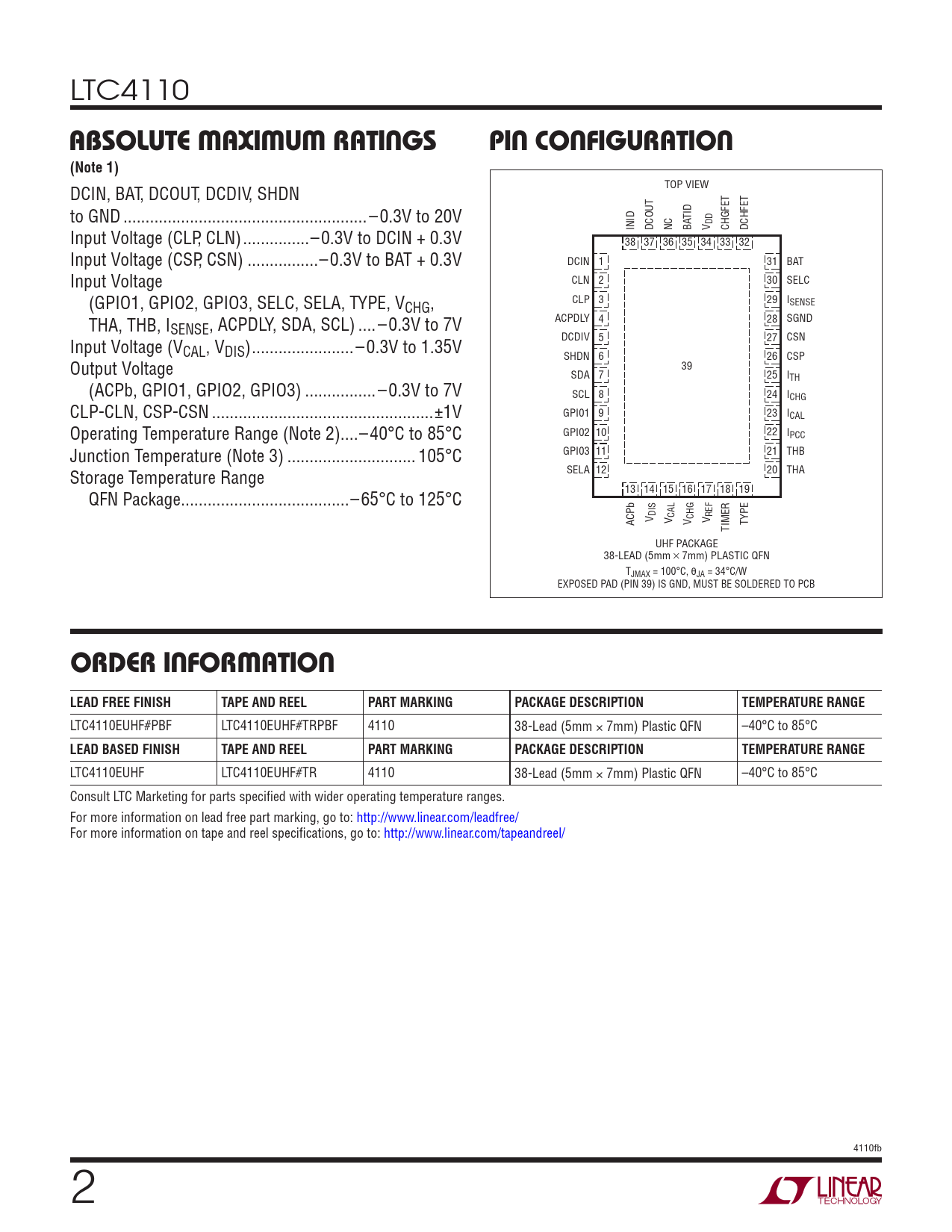LTC4110EUHF LTC4110EUHF#TR 4110 38-Lead (5mm × 7mm) Plastic QFN –40°C to 85°C Consult LTC Marketing for parts specifi ed with wider operating temperature ranges. For more information on lead free part marking, go to: http://www.linear.com/leadfree/ For more information on tape and reel specifi cations, go to: http://www.linear.com/tapeandreel/ 4110fb 2