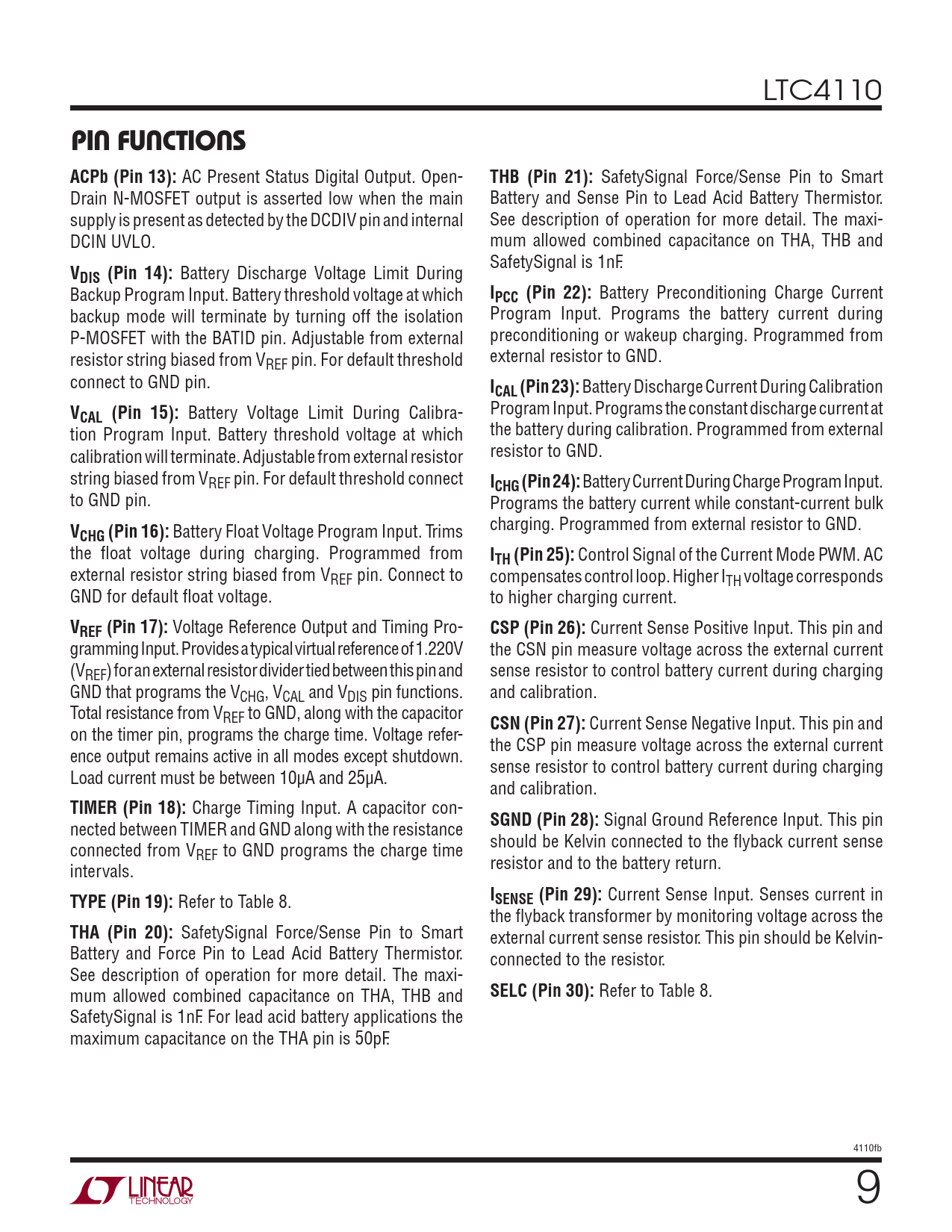 LTC4110 PIN FUNCTIONSACPb (Pin 13): AC Present Status Digital Output. Open- THB (Pin 21): SafetySignal Force/Sense Pin to Smart Drain N-MOSFET output is asserted low when the main Battery and Sense Pin to Lead Acid Battery Thermistor. supply is present as detected by the DCDIV pin and internal See description of operation for more detail. The maxi- DCIN UVLO. mum allowed combined capacitance on THA, THB and SafetySignal is 1nF. VDIS (Pin 14): Battery Discharge Voltage Limit During Backup Program Input. Battery threshold voltage at which IPCC (Pin 22): Battery Preconditioning Charge Current backup mode will terminate by turning off the isolation Program Input. Programs the battery current during P-MOSFET with the BATID pin. Adjustable from external preconditioning or wakeup charging. Programmed from resistor string biased from V external resistor to GND. REF pin. For default threshold connect to GND pin. ICAL (Pin 23): Battery Discharge Current During Calibration V Program Input. Programs the constant discharge current at CAL (Pin 15): Battery Voltage Limit During Calibra- tion Program Input. Battery threshold voltage at which the battery during calibration. Programmed from external calibration will terminate. Adjustable from external resistor resistor to GND. string biased from VREF pin. For default threshold connect ICHG (Pin 24): Battery Current During Charge Program Input. to GND pin. Programs the battery current while constant-current bulk V charging. Programmed from external resistor to GND. CHG (Pin 16): Battery Float Voltage Program Input. Trims the fl oat voltage during charging. Programmed from ITH (Pin 25): Control Signal of the Current Mode PWM. AC external resistor string biased from VREF pin. Connect to compensates control loop. Higher ITH voltage corresponds GND for default fl oat voltage. to higher charging current. VREF (Pin 17): Voltage Reference Output and Timing Pro- CSP (Pin 26): Current Sense Positive Input. This pin and gramming Input. Provides a typical virtual reference of 1.220V the CSN pin measure voltage across the external current (VREF) for an external resistor divider tied between this pin and sense resistor to control battery current during charging GND that programs the VCHG, VCAL and VDIS pin functions. and calibration. Total resistance from VREF to GND, along with the capacitor CSN (Pin 27): Current Sense Negative Input. This pin and on the timer pin, programs the charge time. Voltage refer- the CSP pin measure voltage across the external current ence output remains active in all modes except shutdown. sense resistor to control battery current during charging Load current must be between 10μA and 25μA. and calibration. TIMER (Pin 18): Charge Timing Input. A capacitor con- SGND (Pin 28): Signal Ground Reference Input. This pin nected between TIMER and GND along with the resistance should be Kelvin connected to the fl yback current sense connected from VREF to GND programs the charge time intervals. resistor and to the battery return. TYPE (Pin 19): Refer to Table 8. ISENSE (Pin 29): Current Sense Input. Senses current in the fl yback transformer by monitoring voltage across the THA (Pin 20): SafetySignal Force/Sense Pin to Smart external current sense resistor. This pin should be Kelvin- Battery and Force Pin to Lead Acid Battery Thermistor. connected to the resistor. See description of operation for more detail. The maxi- mum allowed combined capacitance on THA, THB and SELC (Pin 30): Refer to Table 8. SafetySignal is 1nF. For lead acid battery applications the maximum capacitance on the THA pin is 50pF. 4110fb 9