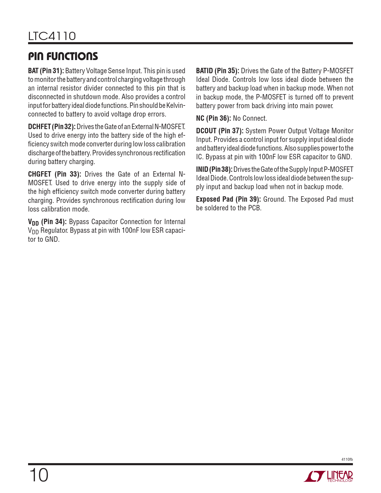 LTC4110 PIN FUNCTIONSBAT (Pin 31): Battery Voltage Sense Input. This pin is used BATID (Pin 35): Drives the Gate of the Battery P-MOSFET to monitor the battery and control charging voltage through Ideal Diode. Controls low loss ideal diode between the an internal resistor divider connected to this pin that is battery and backup load when in backup mode. When not disconnected in shutdown mode. Also provides a control in backup mode, the P-MOSFET is turned off to prevent input for battery ideal diode functions. Pin should be Kelvin- battery power from back driving into main power. connected to battery to avoid voltage drop errors. NC (Pin 36): No Connect. DCHFET (Pin 32): Drives the Gate of an External N-MOSFET. DCOUT (Pin 37): System Power Output Voltage Monitor Used to drive energy into the battery side of the high ef- Input. Provides a control input for supply input ideal diode fi ciency switch mode converter during low loss calibration and battery ideal diode functions. Also supplies power to the discharge of the battery. Provides synchronous rectifi cation IC. Bypass at pin with 100nF low ESR capacitor to GND. during battery charging. INID (Pin 38): Drives the Gate of the Supply Input P-MOSFET CHGFET (Pin 33): Drives the Gate of an External N- Ideal Diode. Controls low loss ideal diode between the sup- MOSFET. Used to drive energy into the supply side of ply input and backup load when not in backup mode. the high effi ciency switch mode converter during battery charging. Provides synchronous rectifi cation during low Exposed Pad (Pin 39): Ground. The Exposed Pad must loss calibration mode. be soldered to the PCB. VDD (Pin 34): Bypass Capacitor Connection for Internal VDD Regulator. Bypass at pin with 100nF low ESR capaci- tor to GND. 4110fb 10