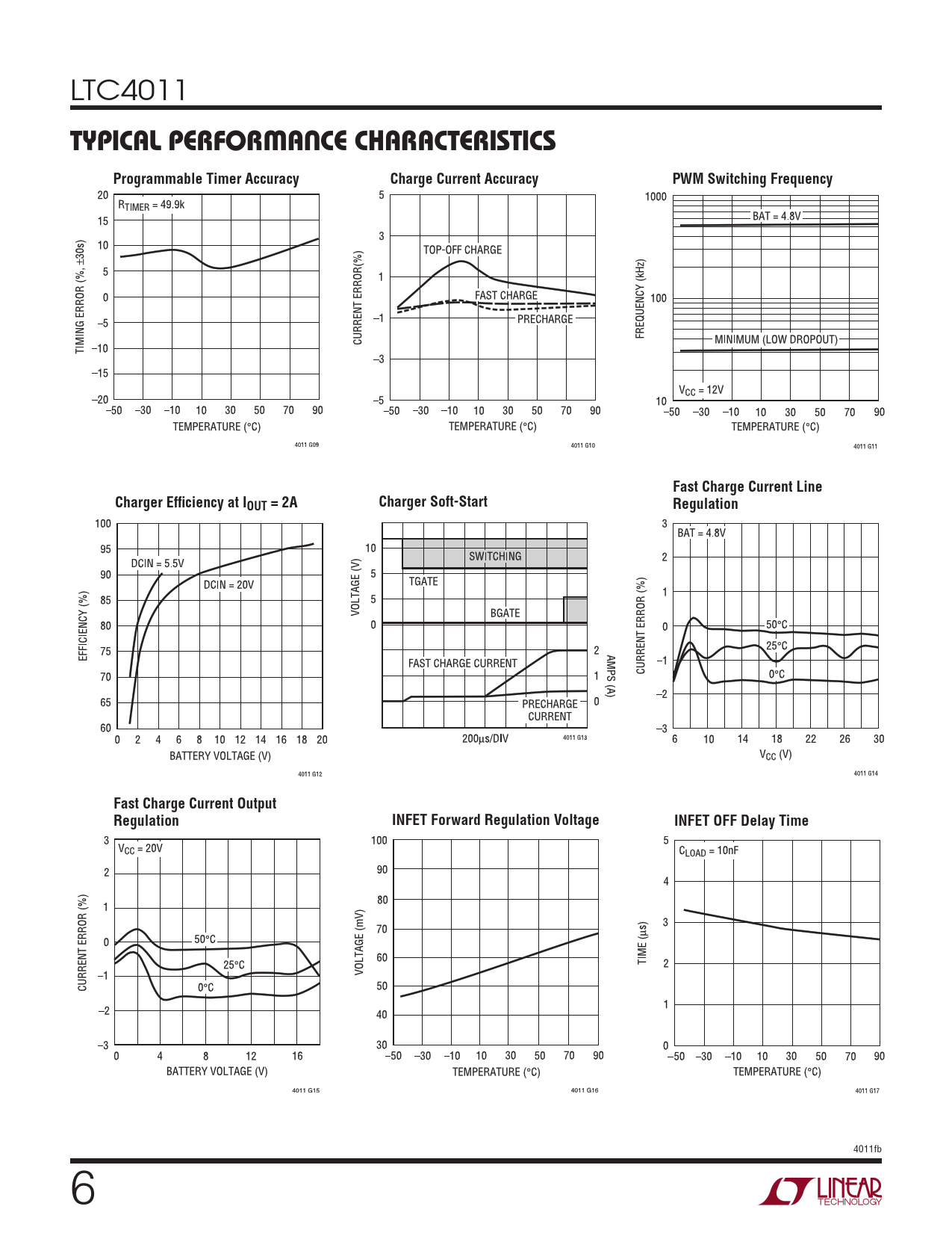 LTC4011 Typical perForMance characTerisTics Programmable Timer AccuracyCharge Current AccuracyPWM Switching FrequencyFast Charge Current Line Charger Efficiency at IOUT = 2ACharger Soft-StartRegulationFast Charge Current Output RegulationINFET Forward Regulation VoltageINFET OFF Delay Time 4011fb Document Outline Features Applications Description Typical Application Absolute Maximum Ratings Pin Configuration Order Information Electrical Characteristics Typical Performance Characteristics Pin Functions Block Diagram Operation Applications Information Package Description Revision History Related Parts