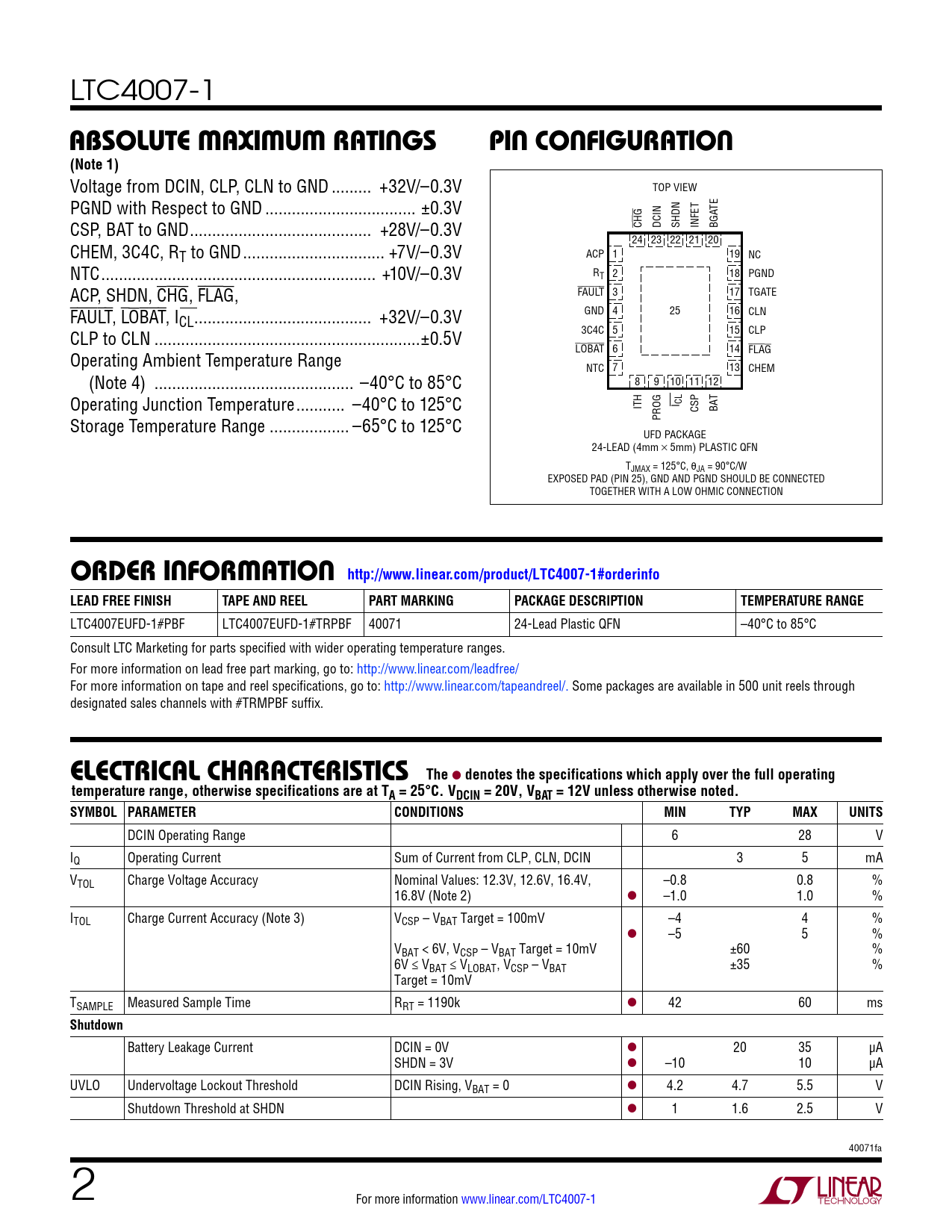 orDer inForMaTion http://www.linear.com/product/LTC4007-1#orderinfo LEAD FREE FINISH TAPE AND REEL PART MARKING PACKAGE DESCRIPTION TEMPERATURE RANGE