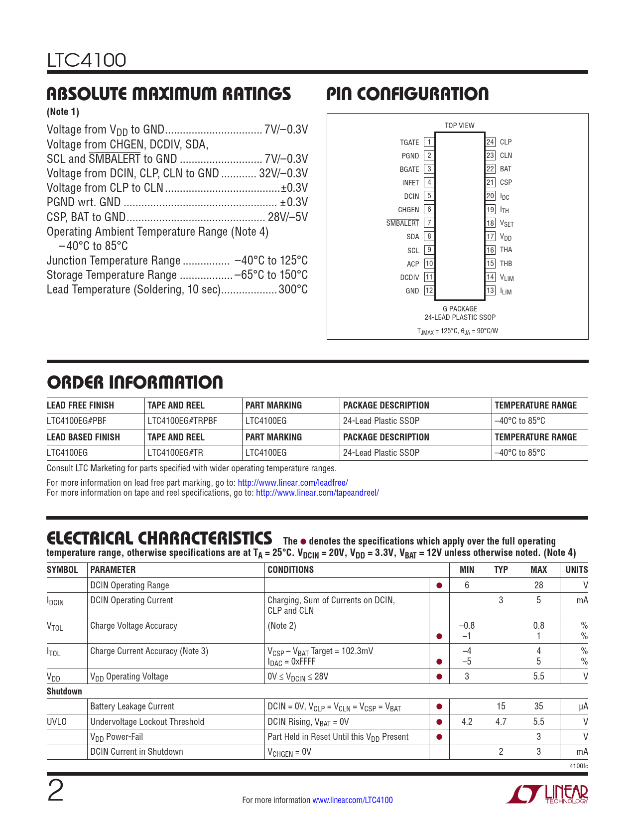 LTC4100EG LTC4100EG#TR LTC4100EG 24-Lead Plastic SSOP –40°C to 85°C Consult LTC Marketing for parts specified with wider operating temperature ranges. For more information on lead free part marking, go to: http://www.linear.com/leadfree/ For more information on tape and reel specifications, go to: http://www.linear.com/tapeandreel/