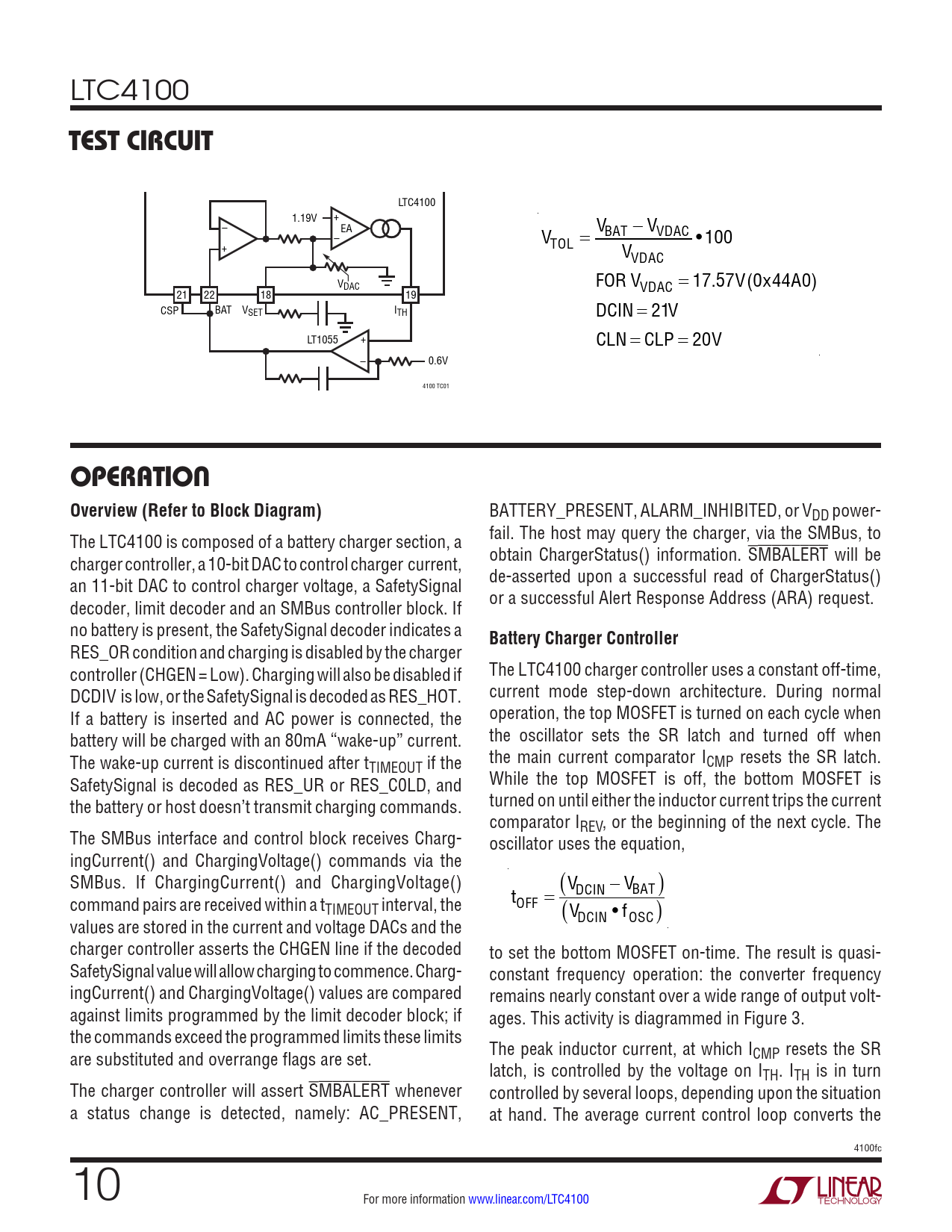 LTC4100 1.19V + – EA VBAT − V – V VDAC •100 + TOL = VVDAC V FOR V DAC VDAC = 17.57V(0x44A0) 21 22 18 19 CSP BAT VSET ITH DCIN = 21V + LT1055 CLN = CLP = 20V – 0.6V 4100 TC01
