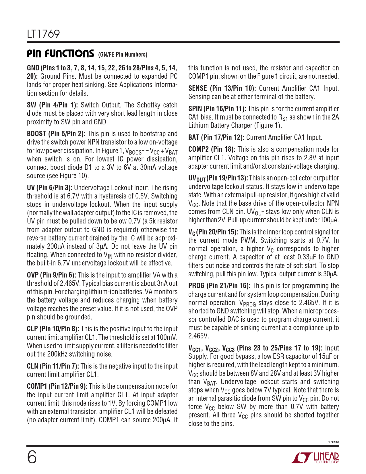 This is the compensation node for BAT. Undervoltage lockout starts and switching stops when V the input current limit amplifier CL1. At input adapter CC goes below 7V typical. Note that there is an internal parasitic diode from SW pin to V current limit, this node rises to 1V. By forcing COMP1 low CC pin. Do not force V with an external transistor, amplifier CL1 will be defeated CC below SW by more than 0.7V with battery present. All three V (no adapter current limit). COMP1 can source 200µA. If CC pins should be shorted together close to the pins. 1769fa 6
