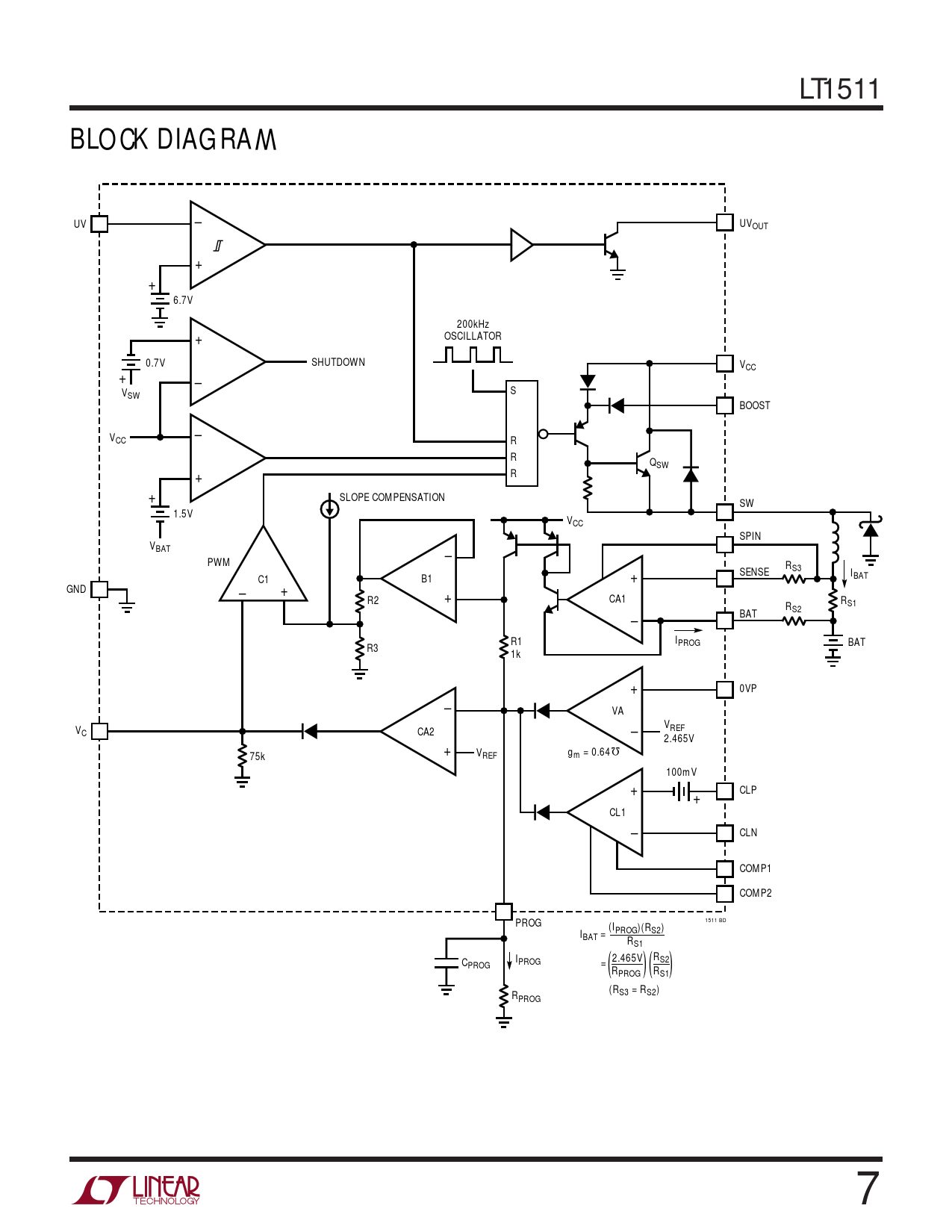 LT1511 WBLOCK DIAGRAM – UV UVOUT + + 6.7V 200kHz + OSCILLATOR 0.7V SHUTDOWN VCC + – V S SW BOOST – VCC R R Q + SW R + SLOPE COMPENSATION SW 1.5V VCC SPIN VBAT – PWM R SENSE S3 I C1 B1 + BAT GND + – + R2 CA1 R R S1 S2 – BAT R1 IPROG BAT R3 1k + 0VP – VA V V REF C CA2 – + 2.465V Ω V 75k REF gm = 0.64 100mV + CLP + CL1 – CLN COMP1 COMP2 1511 BD PROG (I I PROG)(RS2) BAT = RS1 I R C PROG 2.465V S2 ( )( ) PROG = RPROG RS1 (R R S3 = RS2) PROG 7
