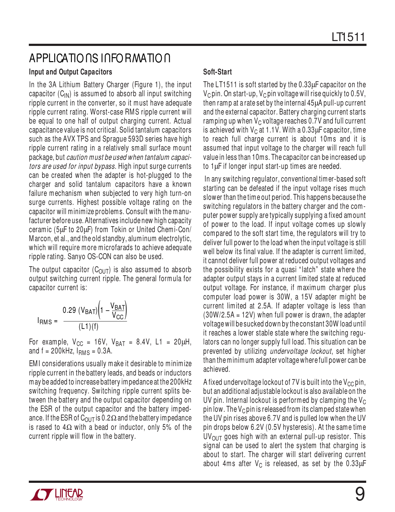 LT1511 UUWUAPPLICATIONS INFORMATION Input and Output CapacitorsSoft-Start In the 3A Lithium Battery Charger (Figure 1), the input The LT1511 is soft started by the 0.33µF capacitor on the capacitor (CIN) is assumed to absorb all input switching VC pin. On start-up, VC pin voltage will rise quickly to 0.5V, ripple current in the converter, so it must have adequate then ramp at a rate set by the internal 45µA pull-up current ripple current rating. Worst-case RMS ripple current will and the external capacitor. Battery charging current starts be equal to one half of output charging current. Actual ramping up when VC voltage reaches 0.7V and full current capacitance value is not critical. Solid tantalum capacitors is achieved with VC at 1.1V. With a 0.33µF capacitor, time such as the AVX TPS and Sprague 593D series have high to reach full charge current is about 10ms and it is ripple current rating in a relatively small surface mount assumed that input voltage to the charger will reach full package, but caution must be used when tantalum capaci- value in less than 10ms. The capacitor can be increased up tors are used for input bypass. High input surge currents to 1µF if longer input start-up times are needed. can be created when the adapter is hot-plugged to the In any switching regulator, conventional timer-based soft charger and solid tantalum capacitors have a known starting can be defeated if the input voltage rises much failure mechanism when subjected to very high turn-on slower than the time out period. This happens because the surge currents. Highest possible voltage rating on the switching regulators in the battery charger and the com- capacitor will minimize problems. Consult with the manu- puter power supply are typically supplying a fixed amount facturer before use. Alternatives include new high capacity of power to the load. If input voltage comes up slowly ceramic (5µF to 20µF) from Tokin or United Chemi-Con/ compared to the soft start time, the regulators will try to Marcon, et al., and the old standby, aluminum electrolytic, deliver full power to the load when the input voltage is still which will require more microfarads to achieve adequate well below its final value. If the adapter is current limited, ripple rating. Sanyo OS-CON can also be used. it cannot deliver full power at reduced output voltages and The output capacitor (COUT) is also assumed to absorb the possibility exists for a quasi “latch” state where the output switching current ripple. The general formula for adapter output stays in a current limited state at reduced capacitor current is: output voltage. For instance, if maximum charger plus computer load power is 30W, a 15V adapter might be VBAT current limited at 2.5A. If adapter voltage is less than 0.29 (VBAT () 1 – ) V (30W/2.5A = 12V) when full power is drawn, the adapter I CC RMS = (L1)(f) voltage will be sucked down by the constant 30W load until it reaches a lower stable state where the switching regu- For example, VCC = 16V, VBAT = 8.4V, L1 = 20µH, lators can no longer supply full load. This situation can be and f = 200kHz, IRMS = 0.3A. prevented by utilizing undervoltage lockout, set higher than the minimum adapter voltage where full power can be EMI considerations usually make it desirable to minimize achieved. ripple current in the battery leads, and beads or inductors may be added to increase battery impedance at the 200kHz A fixed undervoltage lockout of 7V is built into the VCC pin, switching frequency. Switching ripple current splits be- but an additional adjustable lockout is also available on the tween the battery and the output capacitor depending on UV pin. Internal lockout is performed by clamping the VC the ESR of the output capacitor and the battery imped- pin low. The VC pin is released from its clamped state when ance. If the ESR of COUT is 0.2Ω and the battery impedance the UV pin rises above 6.7V and is pulled low when the UV is rased to 4Ω with a bead or inductor, only 5% of the pin drops below 6.2V (0.5V hysteresis). At the same time current ripple will flow in the battery. UVOUT goes high with an external pull-up resistor. This signal can be used to alert the system that charging is about to start. The charger will start delivering current about 4ms after VC is released, as set by the 0.33µF 9