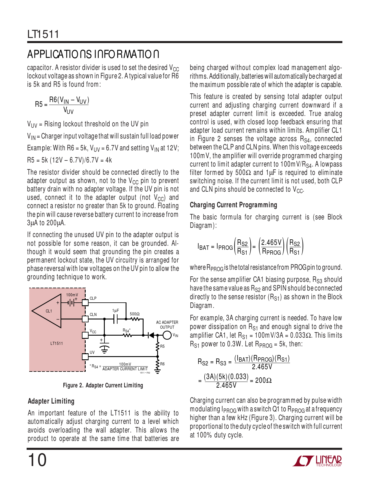 LT1511 UUWUAPPLICATIONS INFORMATION capacitor. A resistor divider is used to set the desired VCC being charged without complex load management algo- lockout voltage as shown in Figure 2. A typical value for R6 rithms. Additionally, batteries will automatically be charged at is 5k and R5 is found from: the maximum possible rate of which the adapter is capable. R6(V – V ) This feature is created by sensing total adapter output R5 = IN UV current and adjusting charging current downward if a VUV preset adapter current limit is exceeded. True analog V control is used, with closed loop feedback ensuring that UV = Rising lockout threshold on the UV pin adapter load current remains within limits. Amplifier CL1 VIN = Charger input voltage that will sustain full load power in Figure 2 senses the voltage across RS4, connected Example: With R6 = 5k, V between the CLP and CLN pins. When this voltage exceeds UV = 6.7V and setting VIN at 12V; 100mV, the amplifier will override programmed charging R5 = 5k (12V – 6.7V)/6.7V = 4k current to limit adapter current to 100mV/RS4. A lowpass The resistor divider should be connected directly to the filter formed by 500Ω and 1µF is required to eliminate adapter output as shown, not to the VCC pin to prevent switching noise. If the current limit is not used, both CLP battery drain with no adapter voltage. If the UV pin is not and CLN pins should be connected to VCC. used, connect it to the adapter output (not VCC) and connect a resistor no greater than 5k to ground. Floating Charging Current Programming the pin will cause reverse battery current to increase from The basic formula for charging current is (see Block 3µA to 200µA. Diagram): If connecting the unused UV pin to the adapter output is not possible for some reason, it can be grounded. Al- RS2 2.465V R I S2 ( ) RS1 ( )( ) BAT = IPROG = though it would seem that grounding the pin creates a RPROG RS1 permanent lockout state, the UV circuitry is arranged for phase reversal with low voltages on the UV pin to allow the where RPROG is the total resistance from PROG pin to ground. grounding technique to work. For the sense amplifier CA1 biasing purpose, RS3 should have the same value as RS2 and SPIN should be connected 100mV + CLP directly to the sense resistor (RS1) as shown in the Block + Diagram. CL1 1µF CLN 500Ω – For example, 3A charging current is needed. To have low AC ADAPTER OUTPUT power dissipation on RS1 and enough signal to drive the VCC RS4* VIN amplifier CA1, let RS1 = 100mV/3A = 0.033Ω. This limits + LT1511 R R5 S1 power to 0.3W. Let RPROG = 5k, then: UV (I R6 R BAT)(RPROG)(RS1) S2 = RS3 = *RS4 = 100mV ADAPTER CURRENT LIMIT 2.465V 1511 • F02 (3A)(5k)(0.033) = = 200Ω Figure 2. Adapter Current Limiting 2.465V Adapter Limiting Charging current can also be programmed by pulse width modulating IPROG with a switch Q1 to RPROG at a frequency An important feature of the LT1511 is the ability to higher than a few kHz (Figure 3). Charging current will be automatically adjust charging current to a level which proportional to the duty cycle of the switch with full current avoids overloading the wall adapter. This allows the at 100% duty cycle. product to operate at the same time that batteries are 10