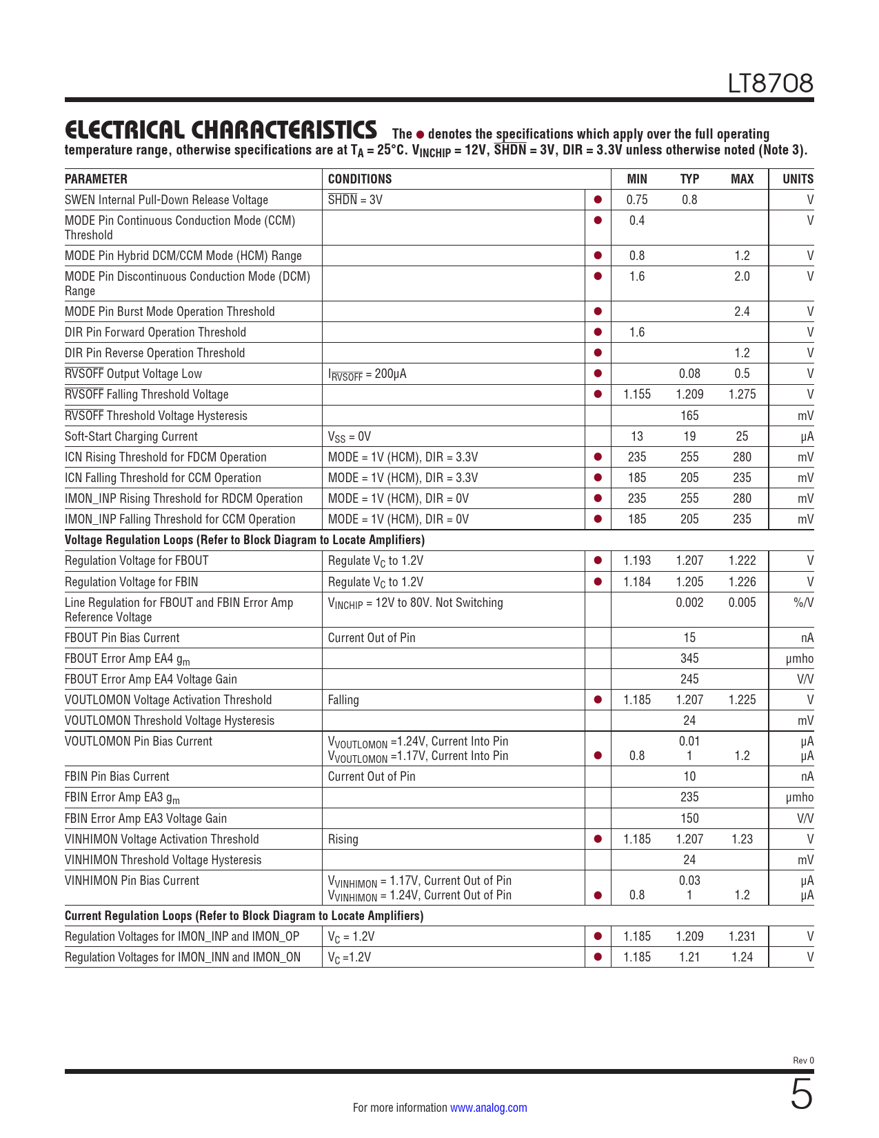 LT8708 ELECTRICAL CHARACTERISTICSThe l denotes the specifications which apply over the full operatingtemperature range, otherwise specifications are at TA = 25°C. VINCHIP = 12V, SHDN = 3V, DIR = 3.3V unless otherwise noted (Note 3).PARAMETERCONDITIONSMINTYPMAXUNITS SWEN Internal Pull-Down Release Voltage SHDN = 3V l 0.75 0.8 V MODE Pin Continuous Conduction Mode (CCM) l 0.4 V Threshold MODE Pin Hybrid DCM/CCM Mode (HCM) Range l 0.8 1.2 V MODE Pin Discontinuous Conduction Mode (DCM) l 1.6 2.0 V Range MODE Pin Burst Mode Operation Threshold l 2.4 V DIR Pin Forward Operation Threshold l 1.6 V DIR Pin Reverse Operation Threshold l 1.2 V RVSOFF Output Voltage Low IRVSOFF = 200μA l 0.08 0.5 V RVSOFF Falling Threshold Voltage l 1.155 1.209 1.275 V RVSOFF Threshold Voltage Hysteresis 165 mV Soft-Start Charging Current VSS = 0V 13 19 25 μA ICN Rising Threshold for FDCM Operation MODE = 1V (HCM), DIR = 3.3V l 235 255 280 mV ICN Falling Threshold for CCM Operation MODE = 1V (HCM), DIR = 3.3V l 185 205 235 mV IMON_INP Rising Threshold for RDCM Operation MODE = 1V (HCM), DIR = 0V l 235 255 280 mV IMON_INP Falling Threshold for CCM Operation MODE = 1V (HCM), DIR = 0V l 185 205 235 mV Voltage Regulation Loops (Refer to Block Diagram to Locate Amplifiers) Regulation Voltage for FBOUT Regulate VC to 1.2V l 1.193 1.207 1.222 V Regulation Voltage for FBIN Regulate VC to 1.2V l 1.184 1.205 1.226 V Line Regulation for FBOUT and FBIN Error Amp VINCHIP = 12V to 80V. Not Switching 0.002 0.005 %/V Reference Voltage FBOUT Pin Bias Current Current Out of Pin 15 nA FBOUT Error Amp EA4 gm 345 μmho FBOUT Error Amp EA4 Voltage Gain 245 V/V VOUTLOMON Voltage Activation Threshold Falling l 1.185 1.207 1.225 V VOUTLOMON Threshold Voltage Hysteresis 24 mV VOUTLOMON Pin Bias Current VVOUTLOMON =1.24V, Current Into Pin 0.01 μA VVOUTLOMON =1.17V, Current Into Pin l 0.8 1 1.2 μA FBIN Pin Bias Current Current Out of Pin 10 nA FBIN Error Amp EA3 gm 235 μmho FBIN Error Amp EA3 Voltage Gain 150 V/V VINHIMON Voltage Activation Threshold Rising l 1.185 1.207 1.23 V VINHIMON Threshold Voltage Hysteresis 24 mV VINHIMON Pin Bias Current VVINHIMON = 1.17V, Current Out of Pin 0.03 μA VVINHIMON = 1.24V, Current Out of Pin l 0.8 1 1.2 μA Current Regulation Loops (Refer to Block Diagram to Locate Amplifiers) Regulation Voltages for IMON_INP and IMON_OP VC = 1.2V l 1.185 1.209 1.231 V Regulation Voltages for IMON_INN and IMON_ON VC =1.2V l 1.185 1.21 1.24 V Rev 0 For more information www.analog.com 5 Document Outline Features Applications Typical Application Description Absolute Maximum Ratings Order Information Pin Configuration Electrical Characteristics Typical Performance Characteristics Typical Performance Characteristics Pin Functions Block Diagram Operation Typographical Conventions Start-Up Start-Up: SHDN Pin Start-Up: SWEN Pin Start-Up: Soft-Start of Switching Regulator Control Overview Power Switch Control Switch Control: Buck Region (VIN >> VOUT) Switch Control: Buck-Boost (VIN ≅ VOUT) Switch Control: Boost Region (VIN << VOUT) Switch Control: Soft-Start Uni and Bidirectional Conduction Bidirectional Conduction: CCM Unidirectional Conduction: DCM Unidirectional Conduction: HCM Unidirectional Conduction: Burst Mode Error Amplifiers VOUT Regulation and Sensing VOUT: Regulation VOUT: Above Regulation VOUT: Below Regulation and Undervoltage VIN Regulation and Sensing VIN: Regulation VIN: Above Regulation and Overvoltage VIN: Below Regulation Current Monitoring and Limiting Monitoring and Limiting: IMON Pins Monitoring: ICP and ICN Pins INTVCC/EXTVCC/GATEVCC/LDO33 Power CLKOUT and Temperature Sensing Applications Information Verify the Power Flow Conditions Operating Frequency Selection Internal Oscillator SYNC Pin and Clock Synchronization CLKOUT Pin and Clock Synchronization Inductor Current Sensing and Slope Compensation RSENSE Selection and Maximum Current RSENSE Selection: Max RSENSE in the Boost Region RSENSE Selection: Max RSENSE in the Buck Region RSENSE Selection: Final RSENSE Value RSENSE Filtering Inductor (L) Selection L Selection: Load Current in Buck and Boost Regions L Selection: Subharmonic Oscillations L Selection: Maximum Current Rating Power MOSFET Selection CIN and COUT Selection Schottky Diode (D1, D2, D3, D4) Selection Topside MOSFET Driver Supply (CB1, DB1, CB2, DB2) Top Driver: Boost Cap Charge Control Block Top Driver: Boost Diodes DB1 and DB2 VINHIMON, VOUTLOMON and RVSOFF IIN and IOUT Current Monitoring and Limiting Loop Compensation INTVCC Regulators and EXTVCC Connection LDO33 Regulator Voltage Lockouts Junction Temperature Measurement Thermal Shutdown Efficiency Considerations Circuit Board Layout Checklist Hot Plugging Considerations Design Example Typical Applications Package Description Typical Application Related Parts