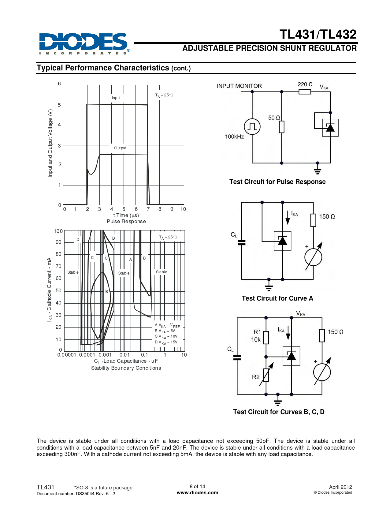 The device is stable under all conditions with a load capacitance not exceeding 50pF. The device is stable under all conditions with a load capacitance between 5nF and 20nF. The device is stable under all conditions with a load capacitance exceeding 300nF. With a cathode current not exceeding 5mA, the device is stable with any load capacitance. TL431 *SO-8 is a future package 8 of 14 April 2012 Document number: DS35044 Rev. 6 - 2