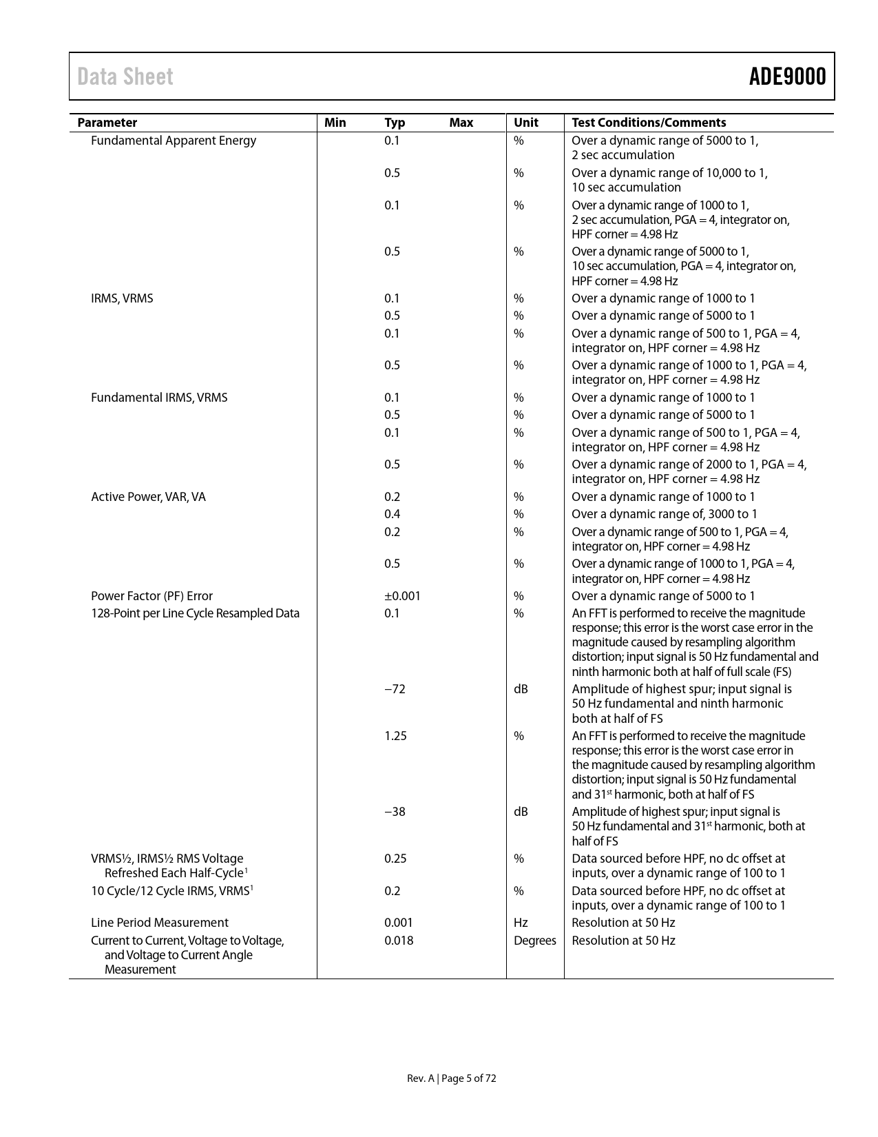link to page 8 link to page 8 Data SheetADE9000ParameterMinTypMaxUnitTest Conditions/Comments Fundamental Apparent Energy 0.1 % Over a dynamic range of 5000 to 1, 2 sec accumulation 0.5 % Over a dynamic range of 10,000 to 1, 10 sec accumulation 0.1 % Over a dynamic range of 1000 to 1, 2 sec accumulation, PGA = 4, integrator on, HPF corner = 4.98 Hz 0.5 % Over a dynamic range of 5000 to 1, 10 sec accumulation, PGA = 4, integrator on, HPF corner = 4.98 Hz IRMS, VRMS 0.1 % Over a dynamic range of 1000 to 1 0.5 % Over a dynamic range of 5000 to 1 0.1 % Over a dynamic range of 500 to 1, PGA = 4, integrator on, HPF corner = 4.98 Hz 0.5 % Over a dynamic range of 1000 to 1, PGA = 4, integrator on, HPF corner = 4.98 Hz Fundamental IRMS, VRMS 0.1 % Over a dynamic range of 1000 to 1 0.5 % Over a dynamic range of 5000 to 1 0.1 % Over a dynamic range of 500 to 1, PGA = 4, integrator on, HPF corner = 4.98 Hz 0.5 % Over a dynamic range of 2000 to 1, PGA = 4, integrator on, HPF corner = 4.98 Hz Active Power, VAR, VA 0.2 % Over a dynamic range of 1000 to 1 0.4 % Over a dynamic range of, 3000 to 1 0.2 % Over a dynamic range of 500 to 1, PGA = 4, integrator on, HPF corner = 4.98 Hz 0.5 % Over a dynamic range of 1000 to 1, PGA = 4, integrator on, HPF corner = 4.98 Hz Power Factor (PF) Error ±0.001 % Over a dynamic range of 5000 to 1 128-Point per Line Cycle Resampled Data 0.1 % An FFT is performed to receive the magnitude response; this error is the worst case error in the magnitude caused by resampling algorithm distortion; input signal is 50 Hz fundamental and ninth harmonic both at half of full scale (FS) −72 dB Amplitude of highest spur; input signal is 50 Hz fundamental and ninth harmonic both at half of FS 1.25 % An FFT is performed to receive the magnitude response; this error is the worst case error in the magnitude caused by resampling algorithm distortion; input signal is 50 Hz fundamental and 31st harmonic, both at half of FS −38 dB Amplitude of highest spur; input signal is 50 Hz fundamental and 31st harmonic, both at half of FS VRMS½, IRMS½ RMS Voltage 0.25 % Data sourced before HPF, no dc offset at Refreshed Each Half-Cycle1 inputs, over a dynamic range of 100 to 1 10 Cycle/12 Cycle IRMS, VRMS1 0.2 % Data sourced before HPF, no dc offset at inputs, over a dynamic range of 100 to 1 Line Period Measurement 0.001 Hz Resolution at 50 Hz Current to Current, Voltage to Voltage, 0.018 Degrees Resolution at 50 Hz and Voltage to Current Angle Measurement Rev. A | Page 5 of 72 Document Outline FEATURES APPLICATIONS GENERAL DESCRIPTION REVISION HISTORY TYPICAL APPLICATIONS CIRCUIT SPECIFICATIONS TIMING CHARACTERISTICS ABSOLUTE MAXIMUM RATINGS THERMAL RESISTANCE ESD CAUTION PIN CONFIGURATION AND FUNCTION DESCRIPTIONS TYPICAL PERFORMANCE CHARACTERISTICS ENERGY LINEARITY OVER SUPPLY AND TEMPERATURE ENERGY ERROR OVER FREQUENCY AND POWER FACTOR ENERGY LINEARITY REPEATABILITY RMS LINEARITY OVER TEMPERATURE AND RMS ERROR OVER FREQUENCY ENERGY AND RMS LINEARITY WITH INTEGRATOR ON ENERGY AND RMS ERROR OVER FREQUENCY WITH INTEGRATOR ON SIGNAL-TO-NOISE RATIO PERFORMANCE TEST CIRCUIT TERMINOLOGY THEORY OF OPERATION MEASUREMENTS Current Channel ADC_REDIRECT Multiplexer Current Channel Gain, xIGAIN IB Calculation Using ICONSEL High-Pass Filter Digital Integrator Phase Compensation Multipoint Phase and Gain Calibration Voltage Channel RMS and Power Measurements Total and Fundamental RMS Total and Fundamental Active Power Total and Fundamental Reactive Power Total and Fundamental Apparent Power No Load Detection, Energy Accumulation, and Power Accumulation Features No Load Detection Feature Energy Accumulation Power Accumulation Digital to Frequency Conversion—CFx Output Energy and Phase Selection Configuring the CFx Pulse Width CFx Pulse Sign Clearing the CFx Accumulator POWER QUALITY MEASUREMENTS Zero-Crossing Detection CF3/ZX Zero-Crossing Timeout Line Period Calculation Angle Measurement Phase Sequence Error Detection Fast RMS½ Measurement 10 Cycle RMS/12 Cycle RMS Dip and Swell Indication Overcurrent Indication Peak Detection Power Factor Total Harmonic Distortion (THD) Resampling 128 Points per Cycle Temperature WAVEFORM BUFFER INTERRUPTS/EVENTS ACCESSING ON-CHIP DATA SPI PROTOCOL OVERVIEW ADDITIONAL COMMUNICATION VERIFICATION REGISTERS CRC OF CONFIGURATION REGISTERS CONFIGURATION LOCK REGISTER MAP REGISTER DETAILS OUTLINE DIMENSIONS ORDERING GUIDE