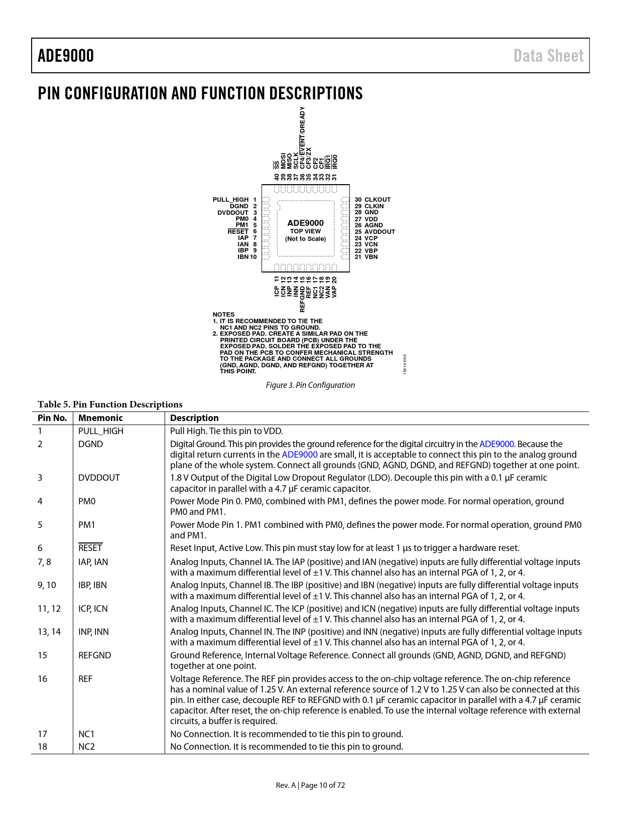 ADE9000Data SheetPIN CONFIGURATION AND FUNCTION DESCRIPTIONSYAD/DRE NT E VKE/ZXSI4/21SOCLF3Q1Q0SSMOMISCFCCFCFIRIR40393837363534333231PULL_HIGH 130 CLKOUTDGND 229 CLKINDVDDOUT 328 GNDPM0 427 VDDPM1 5ADE900026 AGNDRESET 6TOP VIEW25 AVDDOUTIAP 7(Not to Scale)24 VCPIAN 823 VCNIBP 922 VBPIBN 1021 VBN1 1121314151617181920PPFPICICNINNDANAINNGRENC1NC2VVF RENOTES 1. IT IS RECOMMENDED TO TIE THE NC1 AND NC2 PINS TO GROUND. 2. EXPOSED PAD. CREATE A SIMILAR PAD ON THE PRINTED CIRCUIT BOARD (PCB) UNDER THE EXPOSED PAD. SOLDER THE EXPOSED PAD TO THEPAD ON THE PCB TO CONFER MECHANICAL STRENGTH TO THE PACKAGE AND CONNECT ALL GROUNDS 003 (GND, AGND, DGND, AND REFGND) TOGETHER AT THIS POINT. 15210- Figure 3. Pin Configuration Table 5. Pin Function Descriptions Pin No. MnemonicDescription 1 PULL_HIGH Pull High. Tie this pin to VDD. 2 DGND Digital Ground. This pin provides the ground reference for the digital circuitry in the ADE9000. Because the digital return currents in the ADE9000 are small, it is acceptable to connect this pin to the analog ground plane of the whole system. Connect all grounds (GND, AGND, DGND, and REFGND) together at one point. 3 DVDDOUT 1.8 V Output of the Digital Low Dropout Regulator (LDO). Decouple this pin with a 0.1 µF ceramic capacitor in parallel with a 4.7 µF ceramic capacitor. 4 PM0 Power Mode Pin 0. PM0, combined with PM1, defines the power mode. For normal operation, ground PM0 and PM1. 5 PM1 Power Mode Pin 1. PM1 combined with PM0, defines the power mode. For normal operation, ground PM0 and PM1. 6 RESET Reset Input, Active Low. This pin must stay low for at least 1 µs to trigger a hardware reset. 7, 8 IAP, IAN Analog Inputs, Channel IA. The IAP (positive) and IAN (negative) inputs are fully differential voltage inputs with a maximum differential level of ±1 V. This channel also has an internal PGA of 1, 2, or 4. 9, 10 IBP, IBN Analog Inputs, Channel IB. The IBP (positive) and IBN (negative) inputs are fully differential voltage inputs with a maximum differential level of ±1 V. This channel also has an internal PGA of 1, 2, or 4. 11, 12 ICP, ICN Analog Inputs, Channel IC. The ICP (positive) and ICN (negative) inputs are fully differential voltage inputs with a maximum differential level of ±1 V. This channel also has an internal PGA of 1, 2, or 4. 13, 14 INP, INN Analog Inputs, Channel IN. The INP (positive) and INN (negative) inputs are fully differential voltage inputs with a maximum differential level of ±1 V. This channel also has an internal PGA of 1, 2, or 4. 15 REFGND Ground Reference, Internal Voltage Reference. Connect all grounds (GND, AGND, DGND, and REFGND) together at one point. 16 REF Voltage Reference. The REF pin provides access to the on-chip voltage reference. The on-chip reference has a nominal value of 1.25 V. An external reference source of 1.2 V to 1.25 V can also be connected at this pin. In either case, decouple REF to REFGND with 0.1 µF ceramic capacitor in parallel with a 4.7 µF ceramic capacitor. After reset, the on-chip reference is enabled. To use the internal voltage reference with external circuits, a buffer is required. 17 NC1 No Connection. It is recommended to tie this pin to ground. 18 NC2 No Connection. It is recommended to tie this pin to ground. Rev. A | Page 10 of 72 Document Outline FEATURES APPLICATIONS GENERAL DESCRIPTION REVISION HISTORY TYPICAL APPLICATIONS CIRCUIT SPECIFICATIONS TIMING CHARACTERISTICS ABSOLUTE MAXIMUM RATINGS THERMAL RESISTANCE ESD CAUTION PIN CONFIGURATION AND FUNCTION DESCRIPTIONS TYPICAL PERFORMANCE CHARACTERISTICS ENERGY LINEARITY OVER SUPPLY AND TEMPERATURE ENERGY ERROR OVER FREQUENCY AND POWER FACTOR ENERGY LINEARITY REPEATABILITY RMS LINEARITY OVER TEMPERATURE AND RMS ERROR OVER FREQUENCY ENERGY AND RMS LINEARITY WITH INTEGRATOR ON ENERGY AND RMS ERROR OVER FREQUENCY WITH INTEGRATOR ON SIGNAL-TO-NOISE RATIO PERFORMANCE TEST CIRCUIT TERMINOLOGY THEORY OF OPERATION MEASUREMENTS Current Channel ADC_REDIRECT Multiplexer Current Channel Gain, xIGAIN IB Calculation Using ICONSEL High-Pass Filter Digital Integrator Phase Compensation Multipoint Phase and Gain Calibration Voltage Channel RMS and Power Measurements Total and Fundamental RMS Total and Fundamental Active Power Total and Fundamental Reactive Power Total and Fundamental Apparent Power No Load Detection, Energy Accumulation, and Power Accumulation Features No Load Detection Feature Energy Accumulation Power Accumulation Digital to Frequency Conversion—CFx Output Energy and Phase Selection Configuring the CFx Pulse Width CFx Pulse Sign Clearing the CFx Accumulator POWER QUALITY MEASUREMENTS Zero-Crossing Detection CF3/ZX Zero-Crossing Timeout Line Period Calculation Angle Measurement Phase Sequence Error Detection Fast RMS½ Measurement 10 Cycle RMS/12 Cycle RMS Dip and Swell Indication Overcurrent Indication Peak Detection Power Factor Total Harmonic Distortion (THD) Resampling 128 Points per Cycle Temperature WAVEFORM BUFFER INTERRUPTS/EVENTS ACCESSING ON-CHIP DATA SPI PROTOCOL OVERVIEW ADDITIONAL COMMUNICATION VERIFICATION REGISTERS CRC OF CONFIGURATION REGISTERS CONFIGURATION LOCK REGISTER MAP REGISTER DETAILS OUTLINE DIMENSIONS ORDERING GUIDE