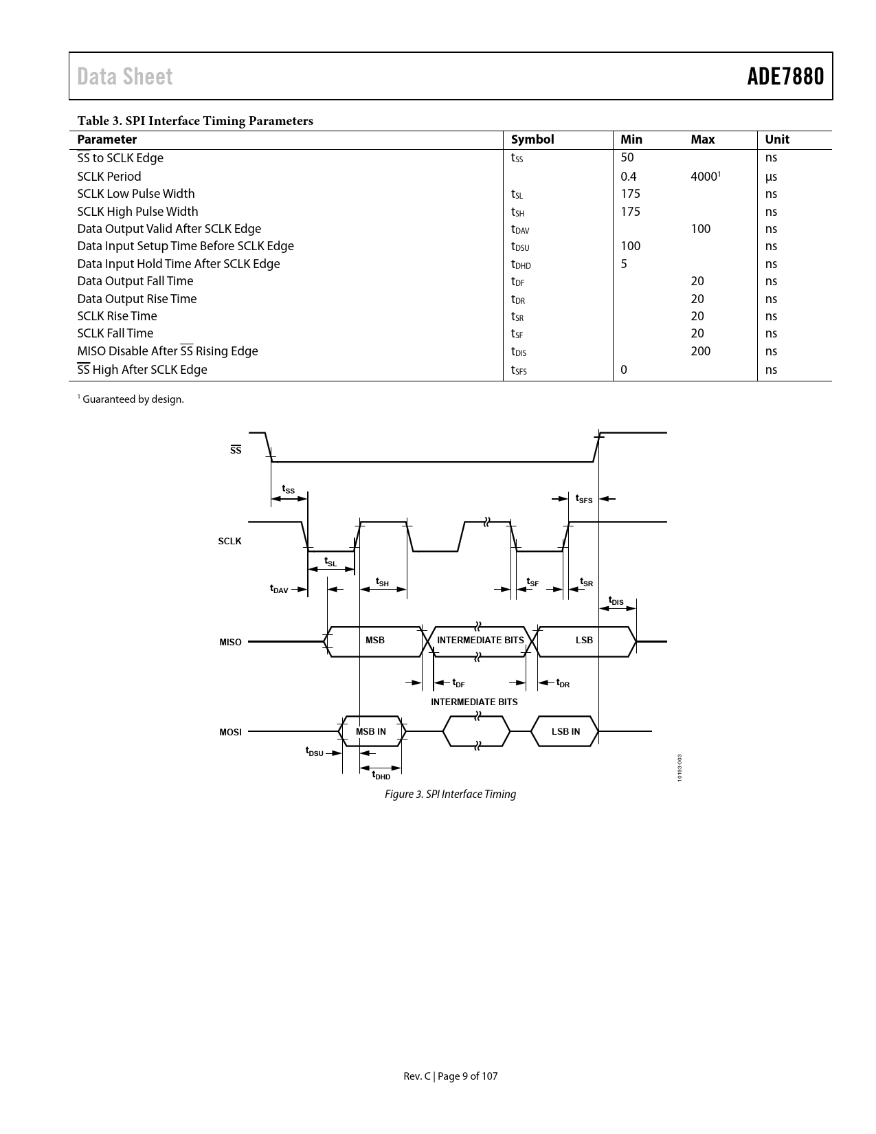 Data Sheet. ADE7880. Table 3. SPI Interface Timing Parameters Parameter Symbol. Min. Max. Unit. tSS. tSFS. SCLK. tSL. tSH. tSF. DAV. tDIS. MISO. MSB